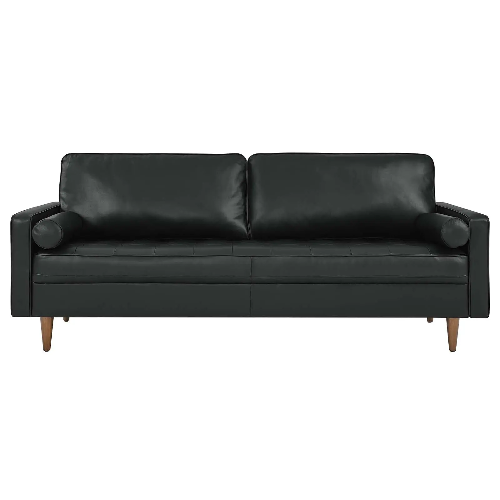 Update your home or apartment with the mid-century style and modern-day convenience of Valour. This comfortable living room sofa features a tailored profile with elegant biscuit tufting and two bolster pillows. Covered in beautiful top grain leather upholstery, Valour has dense foam padding, an innerspring pocket structure, and sinuous spring support for a comprehensive seating experience. This luxe modern sofa comes with walnut-stained wood legs with non-marking foot caps and supports up to 900 lbs. Say goodbye to the days of hauling heavy furniture. This tufted sofa ships in a portable box for easy maneuvering.