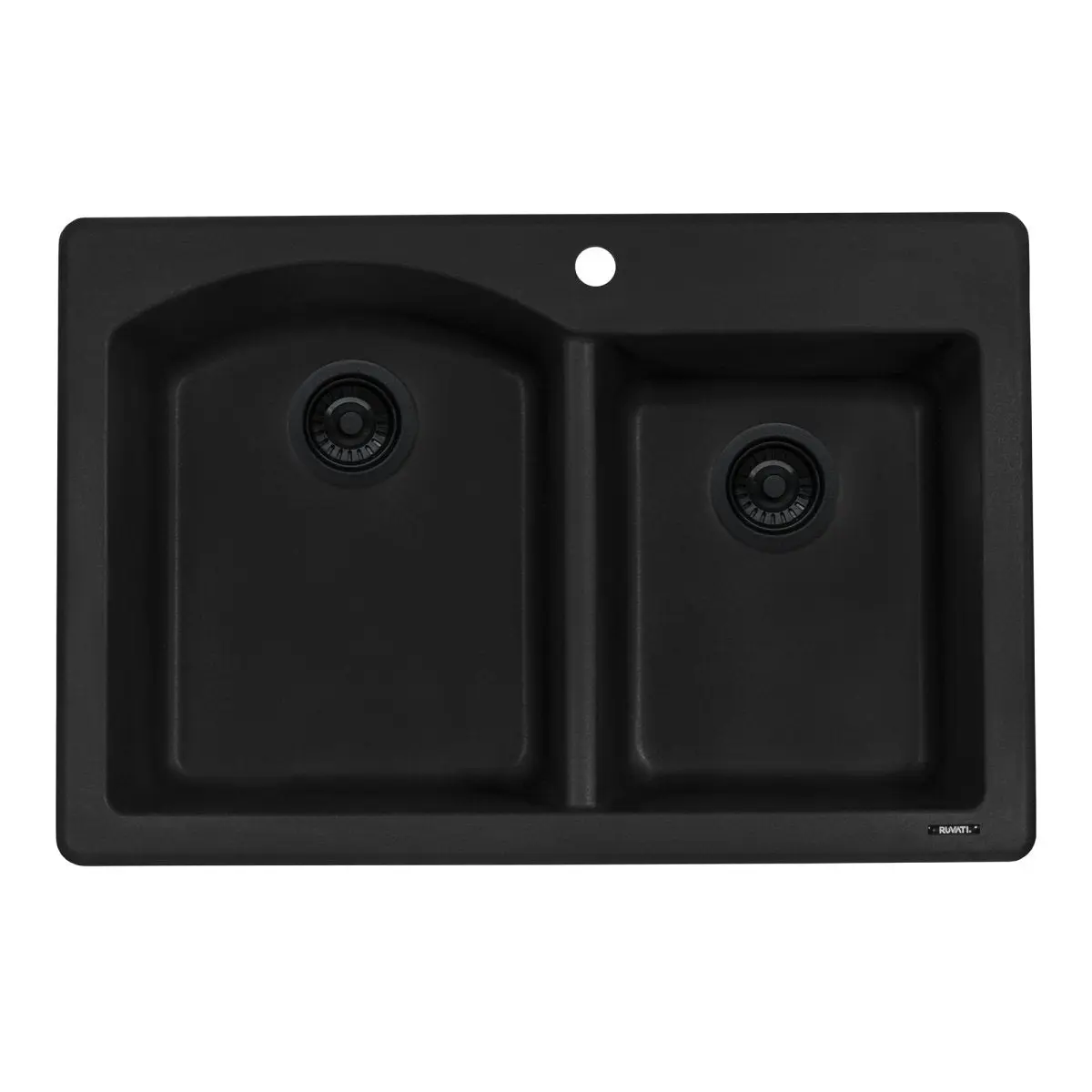 Ruvati uplift the modernity of your kitchen with this 33 x 22 inch Dual-Mount Granite Composite Double Bowl Kitchen Sink. This sink can transform the entire look of the kitchen and make it more presentable. Ruvati's granite collection's Composite Double Bowl Kitchen Sink combines the best of both worlds: dramatic stainless steel with accessories: Strainers, cutting board, and folding rack are built-in accessories that slide on the sink's integrated rails.