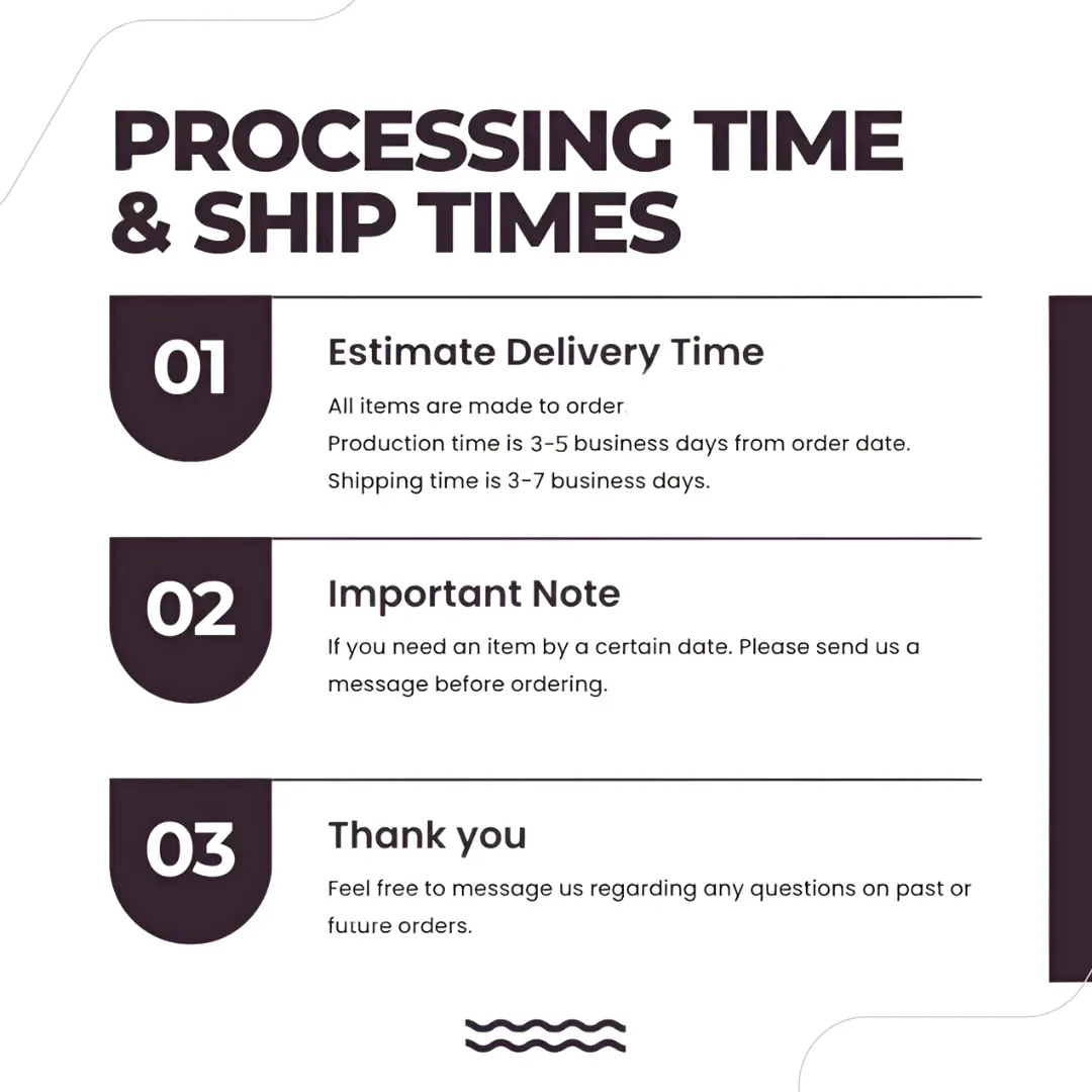 - Processing Time: 1 – 3 business days (in regular seasons) or more depends on holiday seasons.