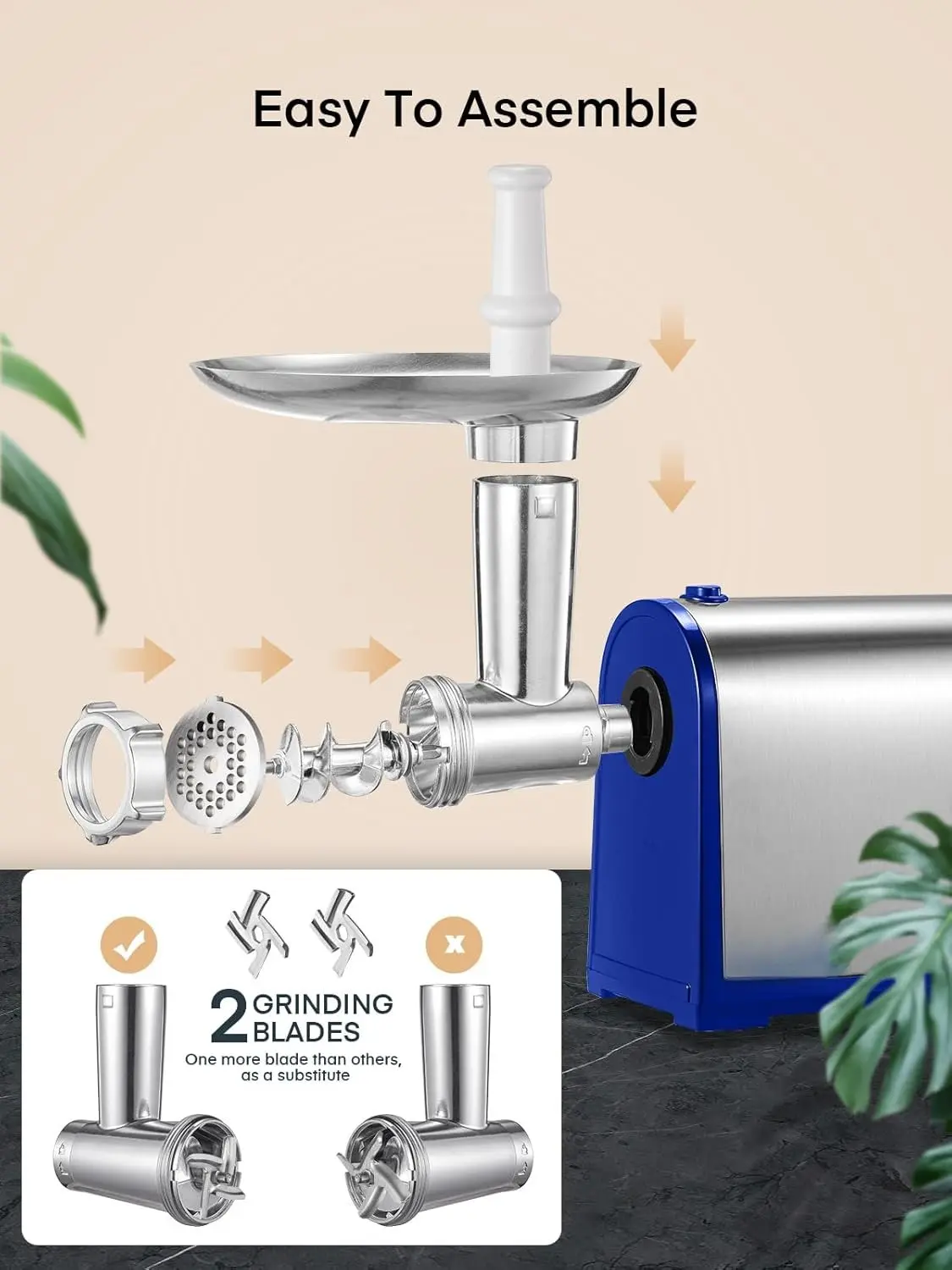 【More Size】 3 IN 1 heavy duty meat mincer with 3 grinding plates (2mm/5mm/7mm) and 3 size sausage stuffer tube can meet your daily needs. 2 stainless steel shreds meat easily, Make ground meat simple and easy