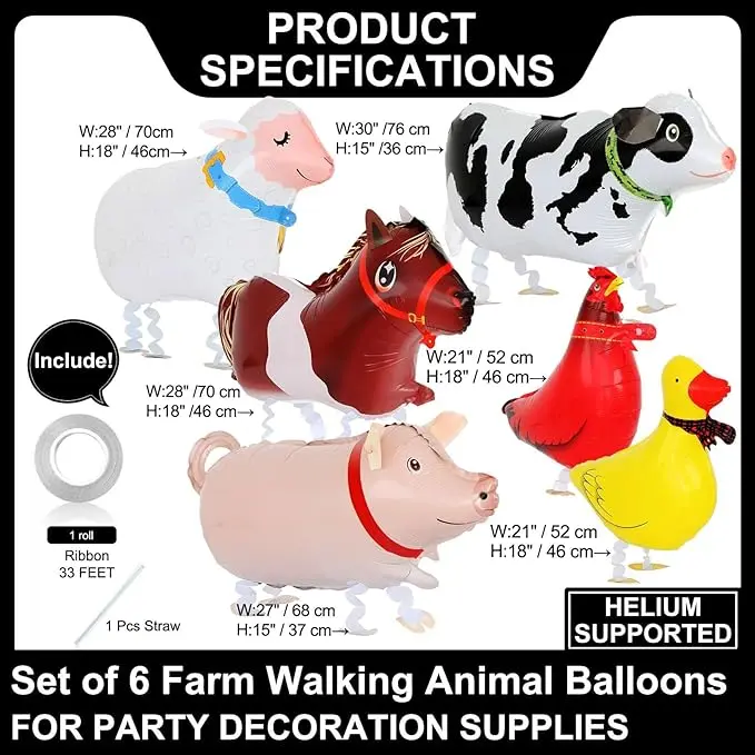 ·Package Include:You will receive 6 pieces different styles of walking farm animals balloons, + 1pcs Straw +1pcs 33 foot Ribbon Roll