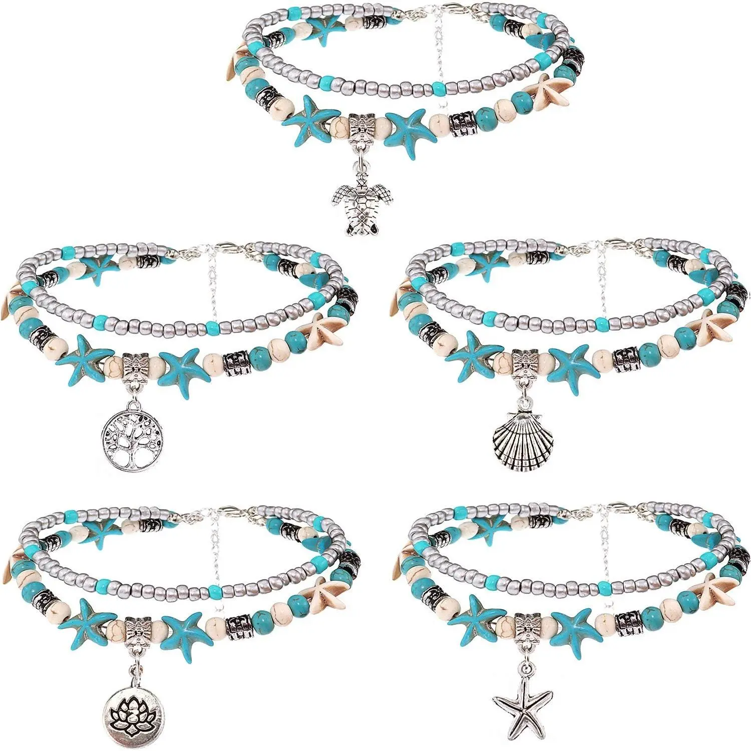 <>Elegant Anklet Collection: This set includes five adjustable ankle bracelets, for women. Each anklet features a design with starfish, shells, and beads. Ideal for beachwear, these anklets add a boho touch to your outfit. The adjustable nature ensures a comfortable fit for various foot sizes.