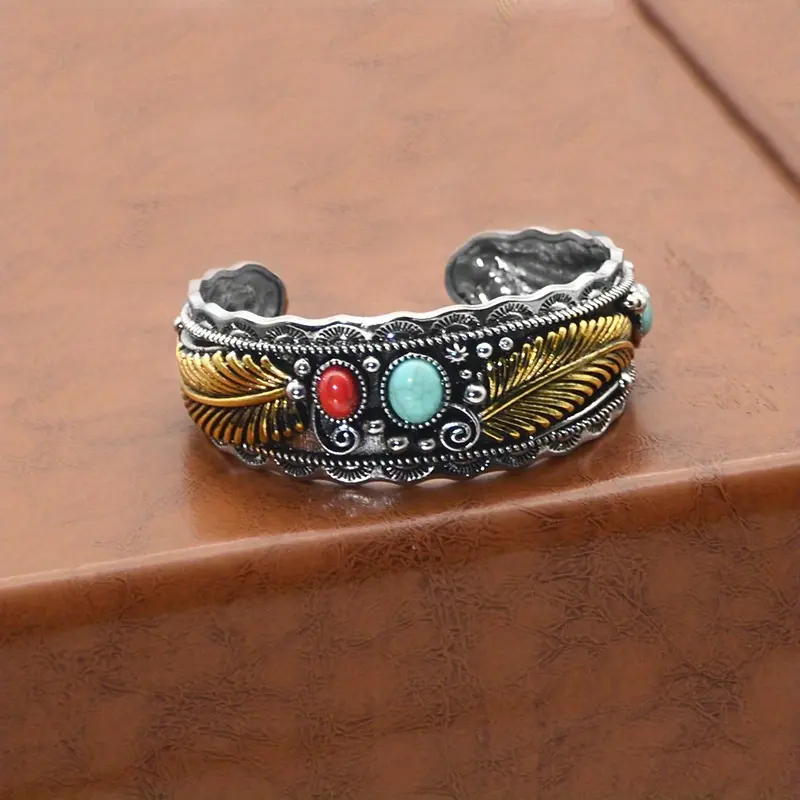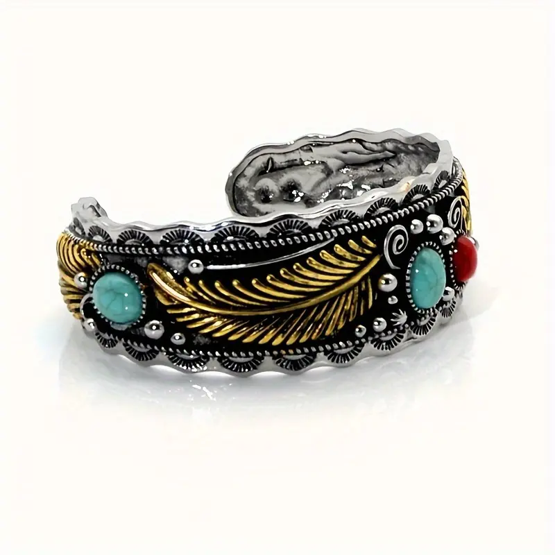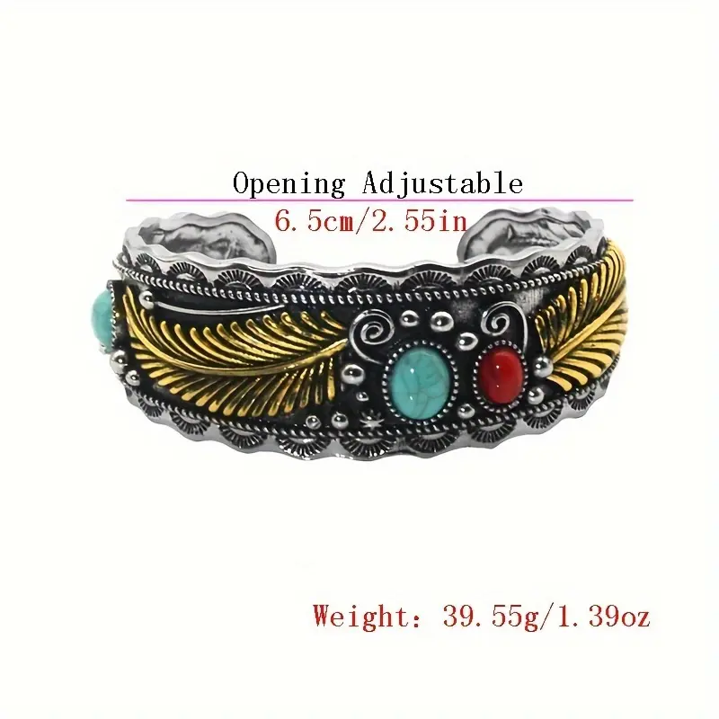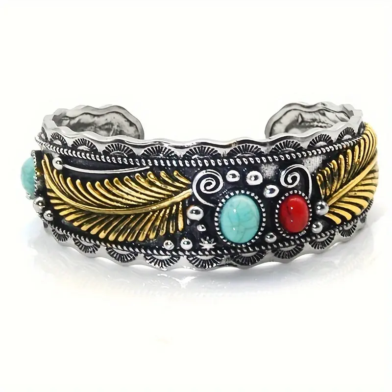 Step into the world of Southwest boho style with our Two-Tone Feather Cuff Bracelet. More than just a piece of jewelry, this accessory is a celebration of heritage and individuality, perfect for anyone who loves to embrace the free-spirited energy of the desert. The intricate gold feather engravings, paired with vibrant turquoise and red stones, create a mesmerizing effect that turns every glance into a moment of admiration.