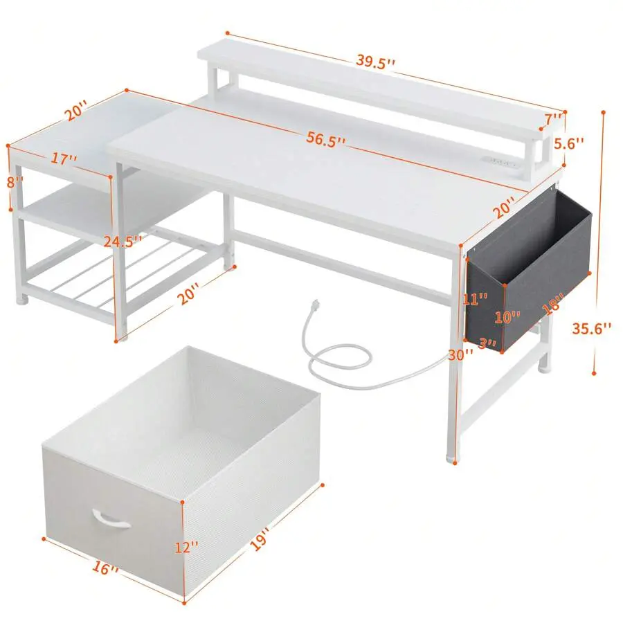 56.5" Computer Desk With File Drawers Cabinet, Study Writing Gaming Desk With Power Outlets, Home Office Desk With Shelves Monitor Stand, Work Table With Printer Space
