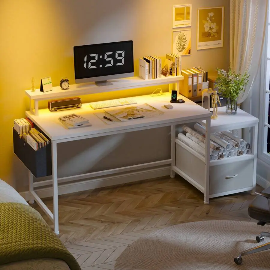 Computer desk with file drawers cabinet provides you plenty of storage room for your books and working documents. The long monitor stand can accommodate 2 monitors. Equipped with 3 Standard Plug Outlets & 2 USB Ports, our gaming desk offers a fast-charging interface for your mobile phones, headphones, tablets, mobile power supplies, and game devices, making your work and life more convenient. Open shelves and side pockets allow you to place printers and store small objects. This desk with storage space helps keep your desk organized. Using this monitor stand can easily raise the screen to eye level, providing a more ergonomic design and effectively reducing back and neck pain. The home office desk is constructed with a sturdy metal frame and a wooden tabletop, ensuring stability while typing, writing, or gaming. Anti-slip and scratch protection under your legs keep your floor free from scratches and reduce noise when moving.