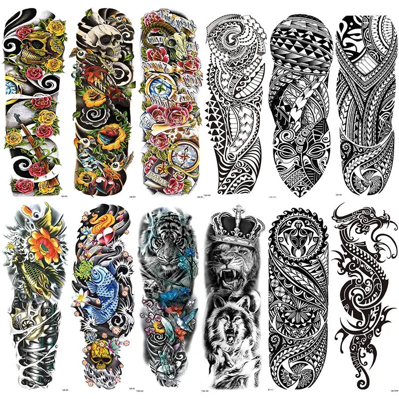 12 Temporary Full Arm Tattoos, Colorful Skull Lion Tiger Fish Tribal Dragon Stickers, Waterproof Realistic Body Art for Men & Women, Temporary Fake Tattoo