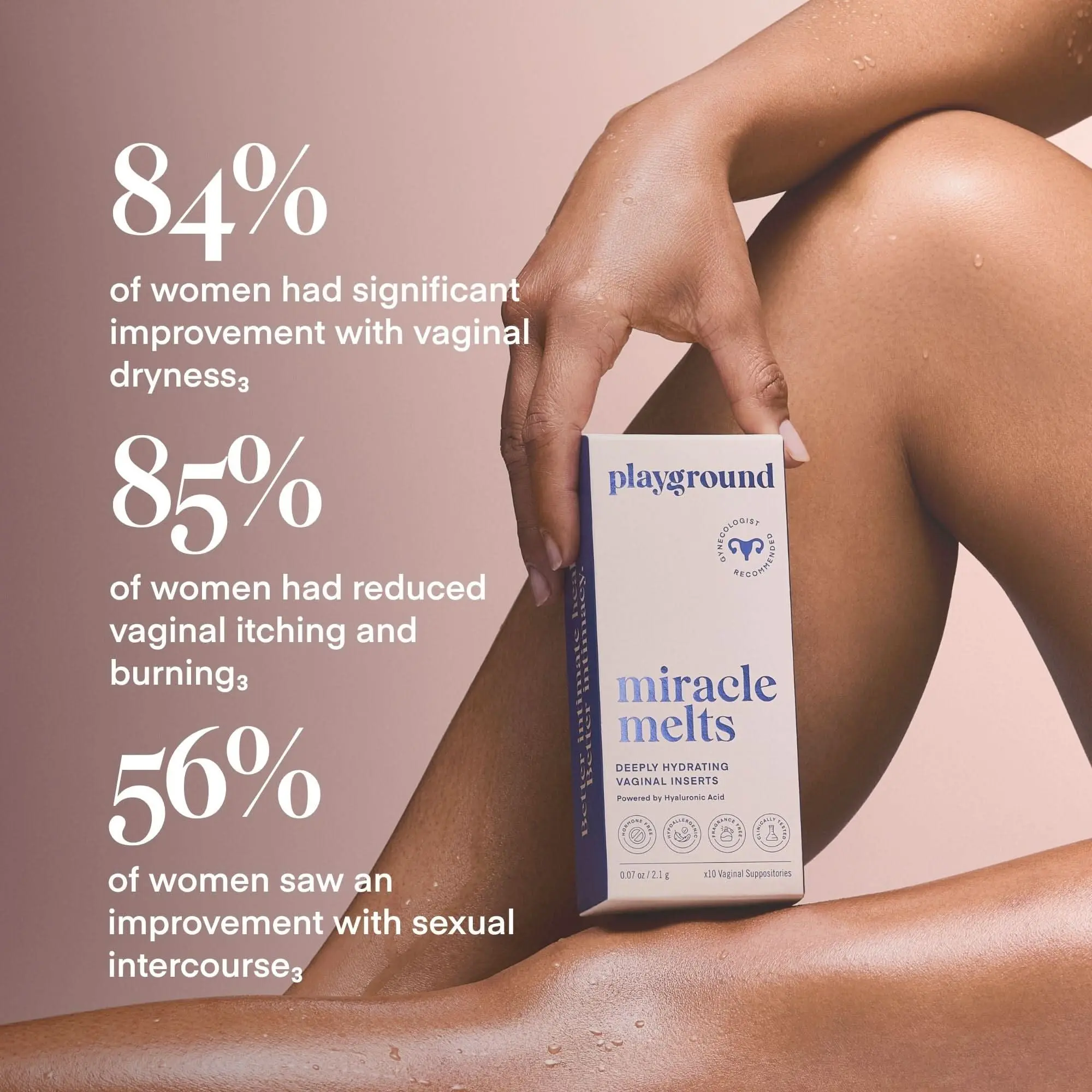 As I got along in my menopausal journey, the dryness was so terrible. Even getting a PAP was painful. Way to make you feel old - thanks body! When I asked for a solution, my OBGYN (who I love) only sighed and said “welcome to the club”. I started using a beeswax type of melt she recommended and they worked ok but not great. I was very excited to try the Playground Miracle melts and have been SUPER pleased with the results. Not only is sex way better but I just feel YOUNG again down there. Thank you PLAYGROUND for bringing this solution to market. I plan to tell all my friends.