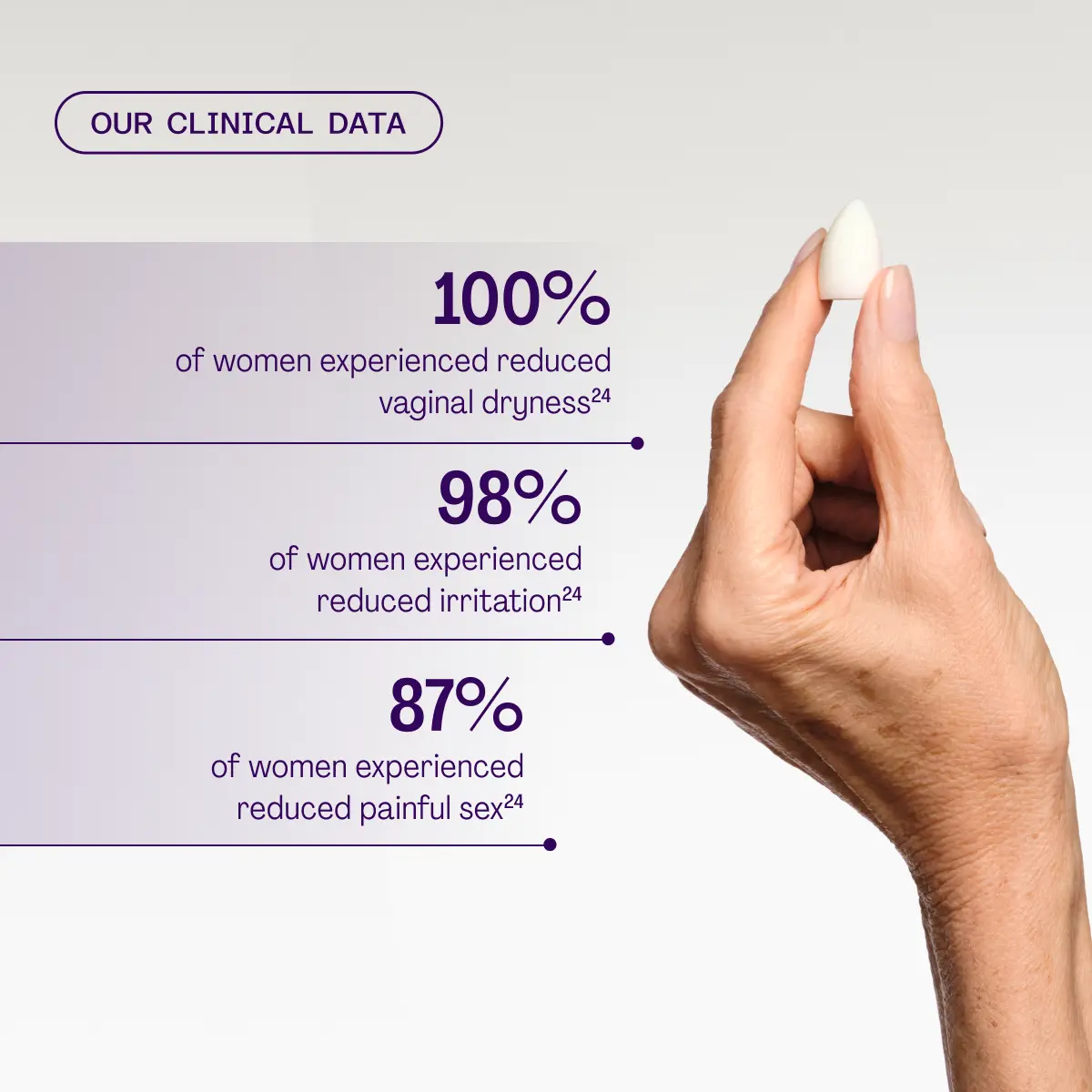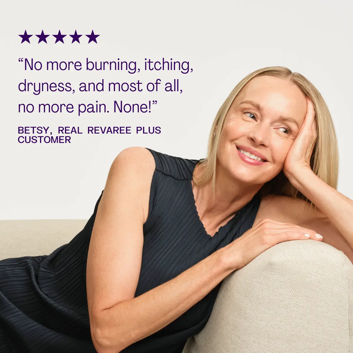 Revaree® Plus provides relief from vaginal dryness in as little as seven days. In a clinical trial, 100% of women experienced dryness relief.¹⁹ ²⁴ Revaree® Plus also relieves irritation, pain, and burning, restoring everyday comfort and pain-free sex.²⁴ ²⁸