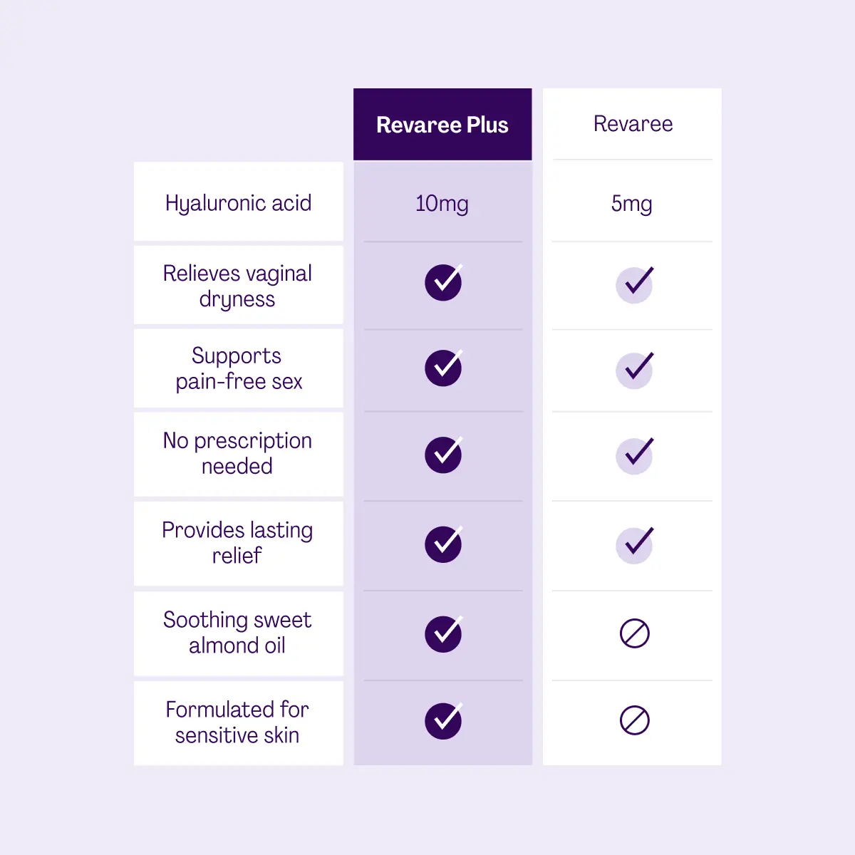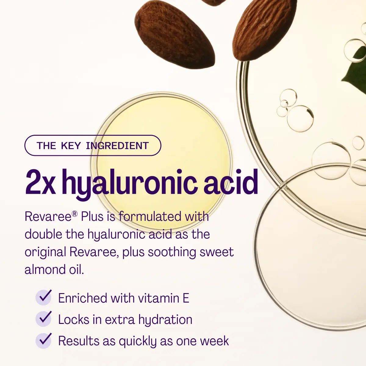 Revaree® Plus is formulated for enhanced hydration, featuring twice as much hyaluronic acid as the original Revaree® and soothing sweet almond oil. Together, these ingredients replenish and lock in natural vaginal moisture for sustained relief.