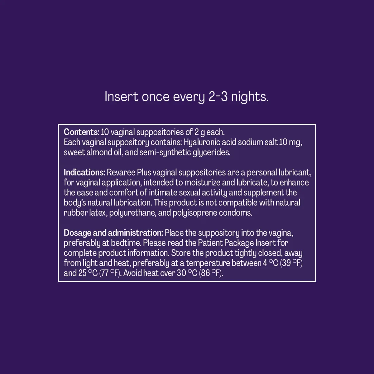 Revaree® Plus is a vaginal insert formulated with 2x hyaluronic acid and soothing sweet almond oil for long-lasting relief from vaginal dryness and discomfort, as well as painful sex.