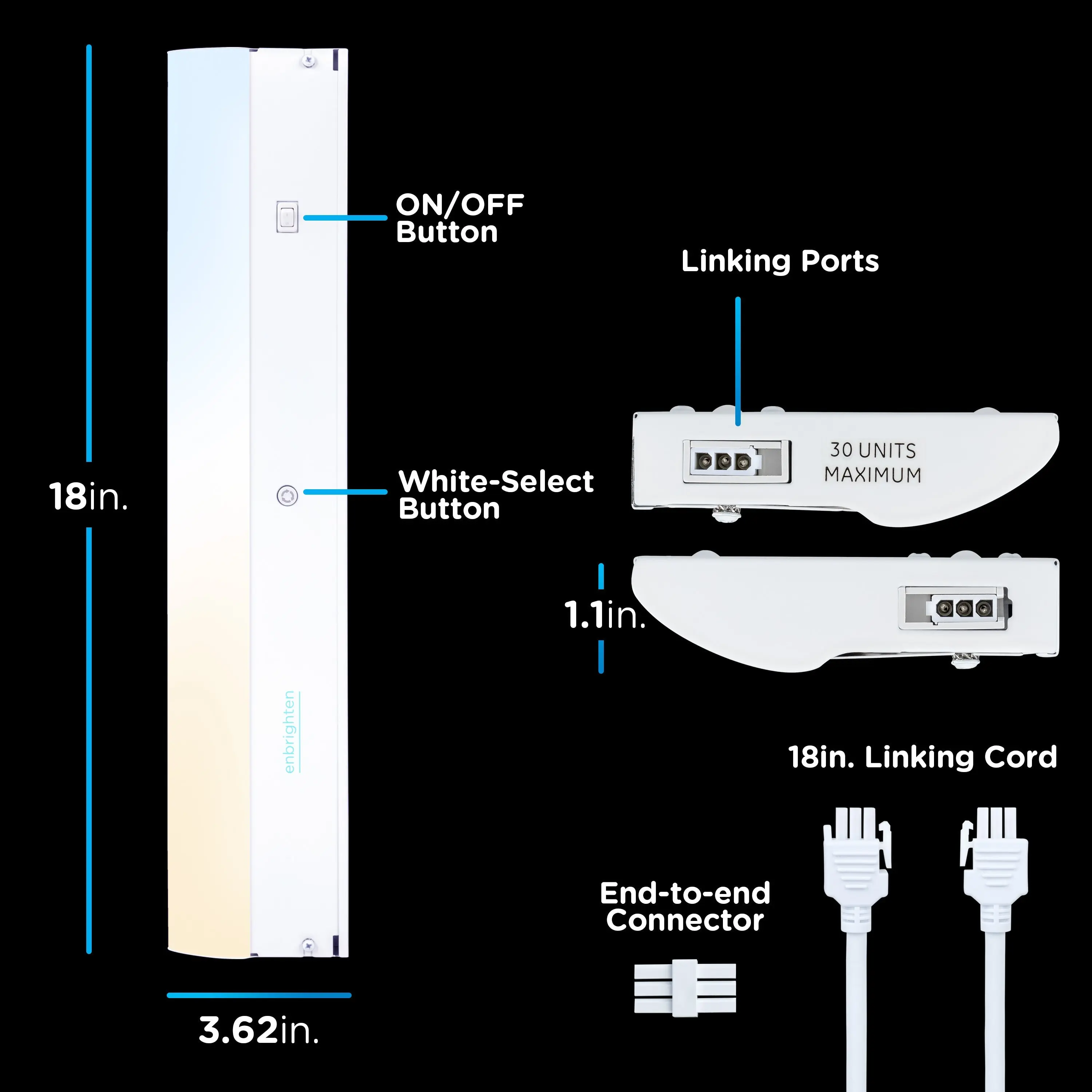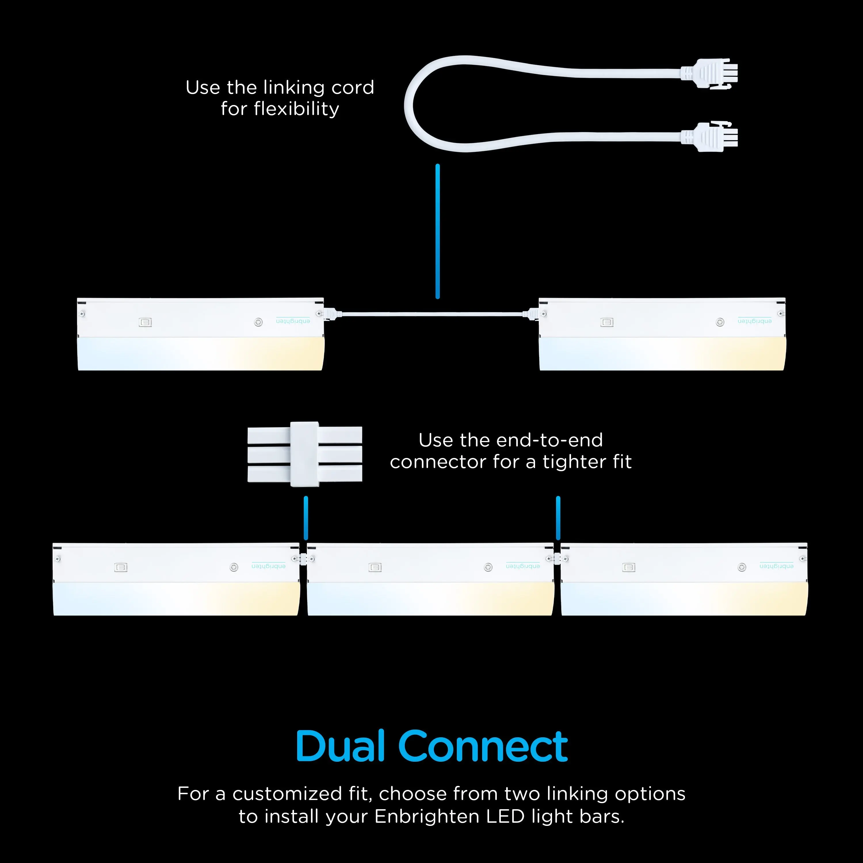 Link additional Enbrighten LED light bars for a customized setup. The dual-connect feature lets you expand your lighting system using linking cords for flexibility and extra reach or end-to-end connectors for a tighter fit. Various lengths of compatible light bars and linking cords are sold separately. Brighten your kitchen, office space, workbench and more with the hardwired Enbrighten LED Light Bar - lighting for life!