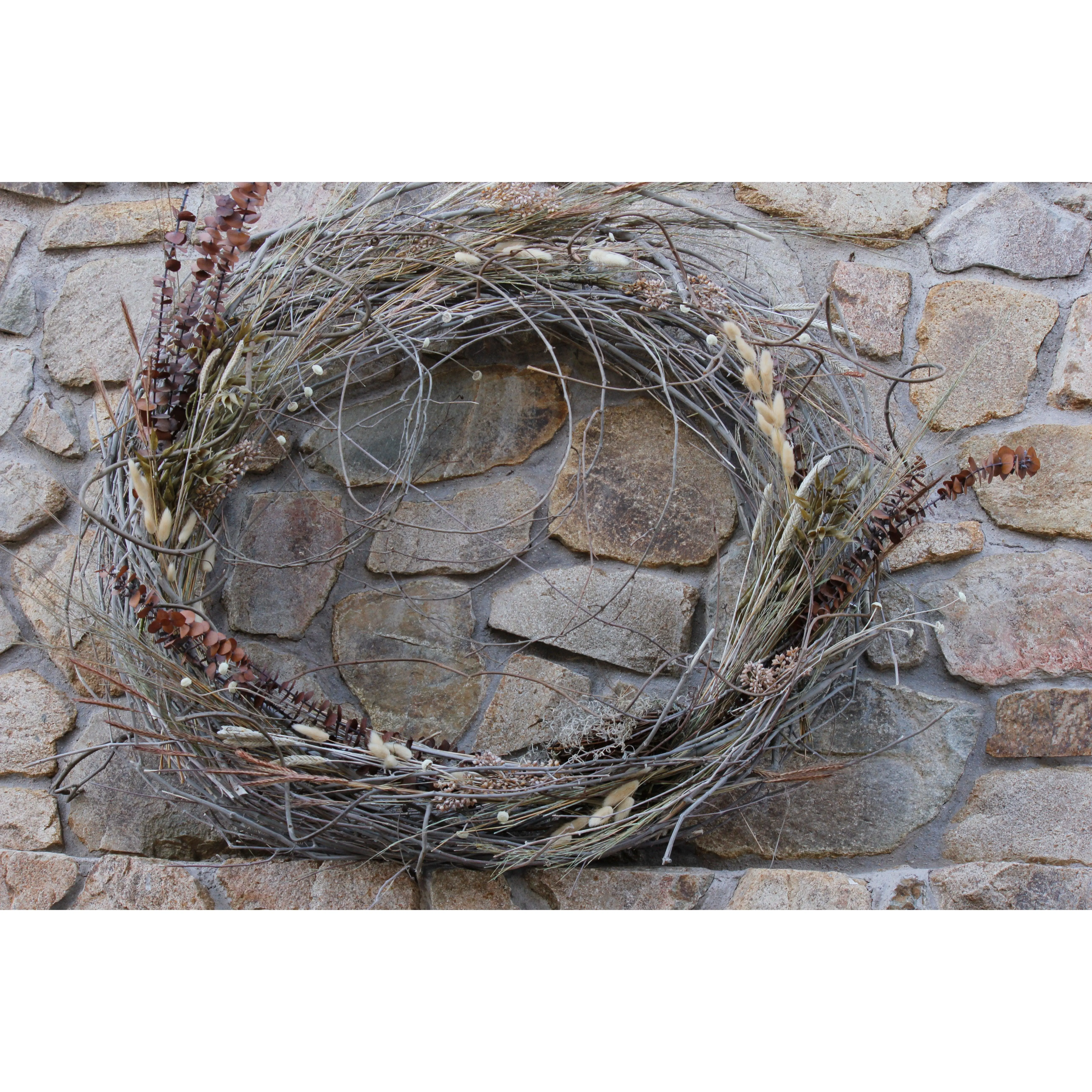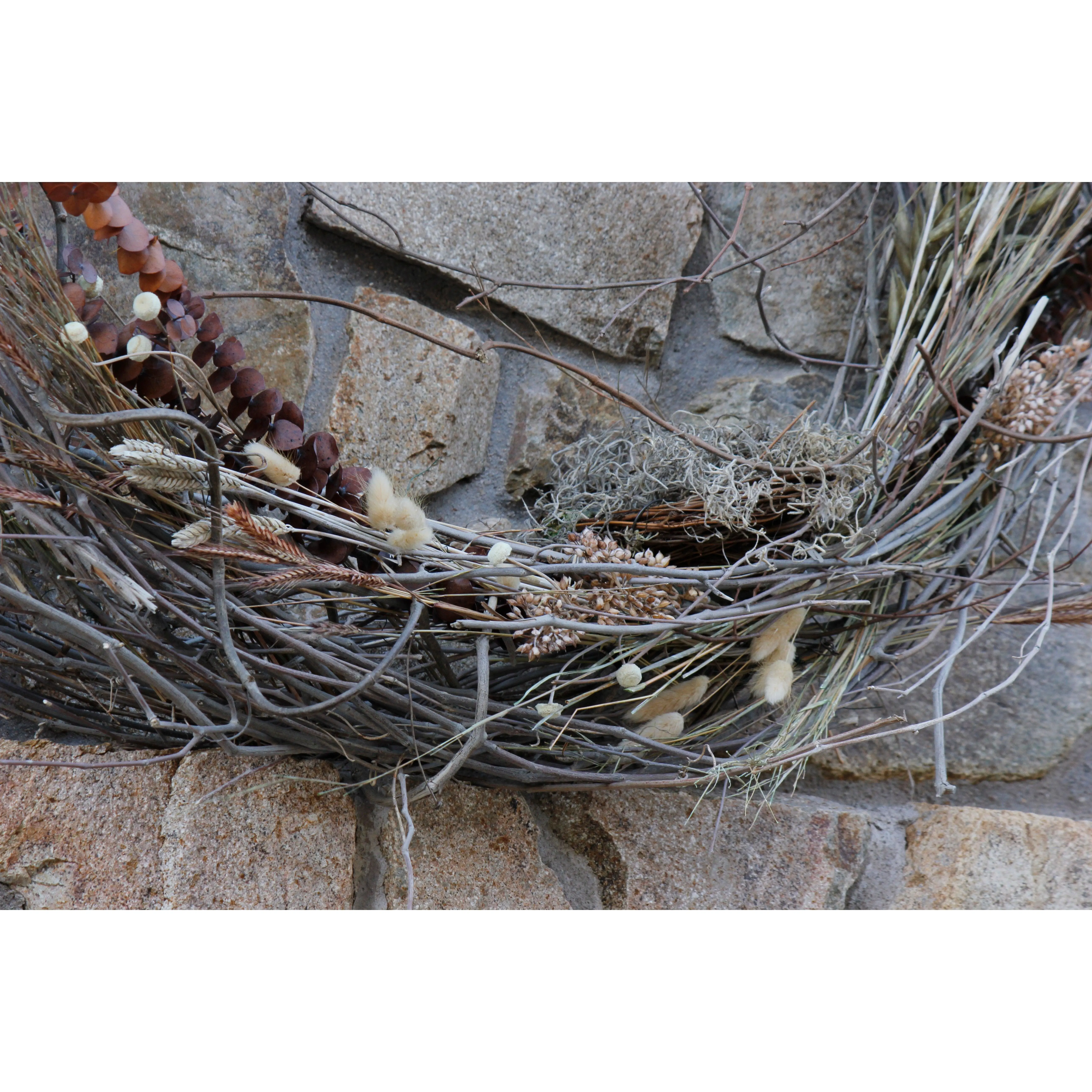 Large dried floral grapevine wreath hand-crafted and made from twisted grapevines. Our hand-crafted grapevine wreath showcases a raw yet organic touch to your home aesthetic. Twisted intertwined grapevines with lightly arranged dried flowers settled into the branches gives a unique woodland feel.