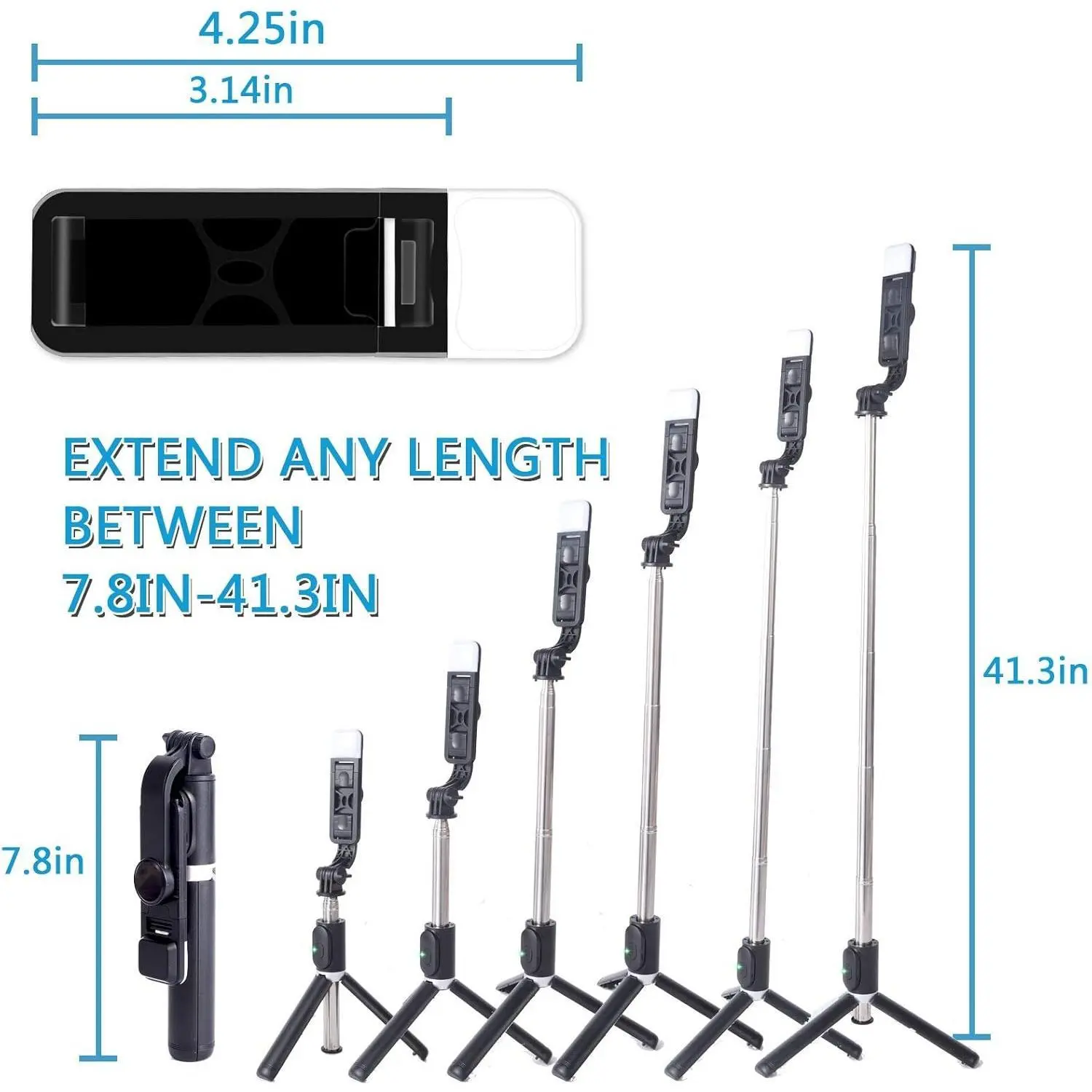 Extendable and Folding Selfie Stick Tripod, extends from 7.6'' to 40.9'' in length, features a lightweight aluminum alloy design, weighs only 6 ounces, and is pocket-sized for easy portability, allowing you to take it anywhere you go.