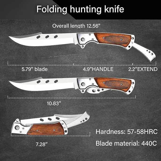 · [LONG BLADE DESIGN] - The blade of this pocket knife is longer than the handle, it's 5.6 inch long, unique design is different from these ordinary folding knives, heavy duty style and well made. 440C Steel blade that ensures long-term operation without erosion, good rust resistance and high durability.