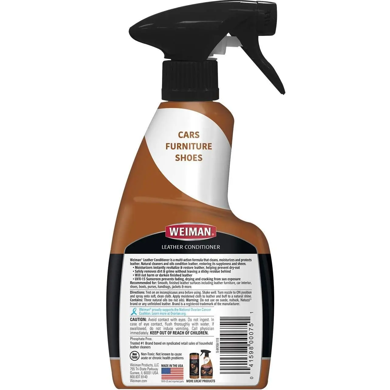 Weiman Leather Cleaner & Conditioner cleans, conditions, and protects leather surfaces effortlessly. It uses natural oils to rejuvenate leather while safely removing dirt and residue. Perfect for shoes, accessories, and car interiors, this spray ensures your leather looks sharp. Apply regularly for quick maintenance.
