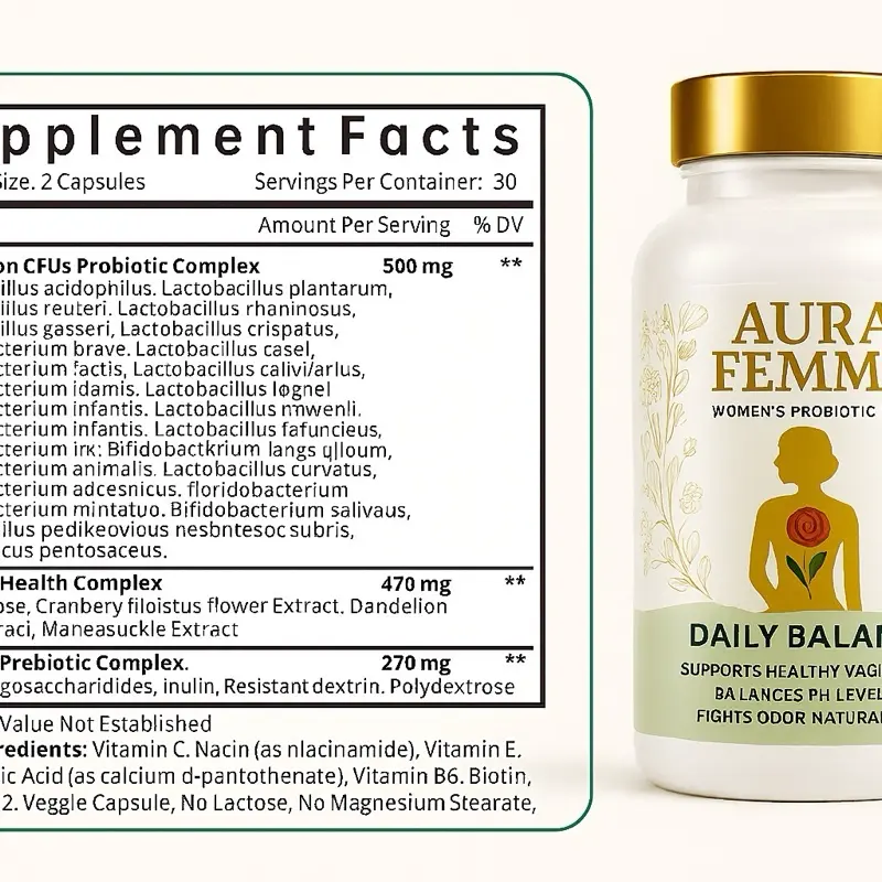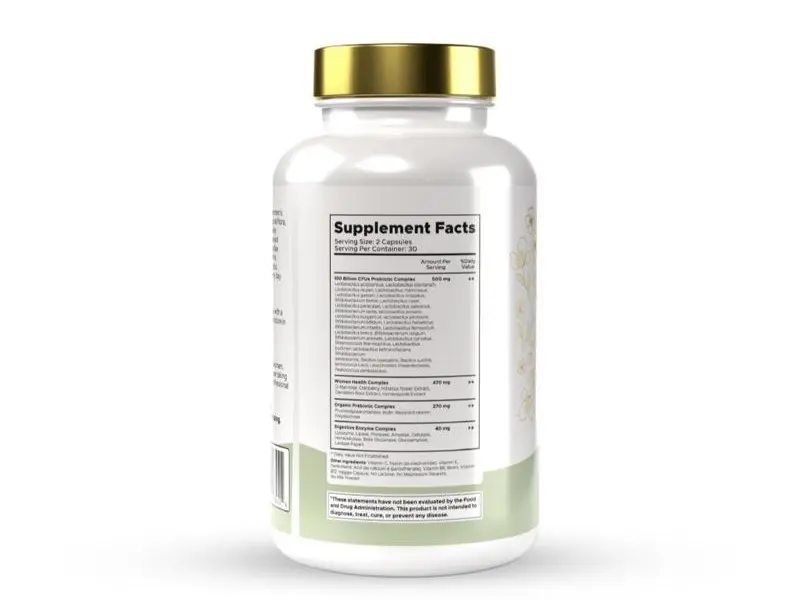 | Ingredients | 100 Billion CFUs Probiotic Complex (Lactobacillus acidophilus, L. rhamnosus, L. crispatus, L. gasseri, L. plantarum, L. reuteri, L. casei, L. paracasei, L. helveticus, Bifidobacterium breve, B. longum, B. lactis, B. bifidum), D-Mannose, Cranberry Extract, Hibiscus Extract, Dandelion Root Extract, Honeysuckle, Prebiotics (FOS, Inulin, Polydextrose), Digestive Enzymes (Protease, Amylase, Cellulase, Lactase), Vitamin C, E, B6, B12, Biotin, Niacin, Calcium Pantothenate |