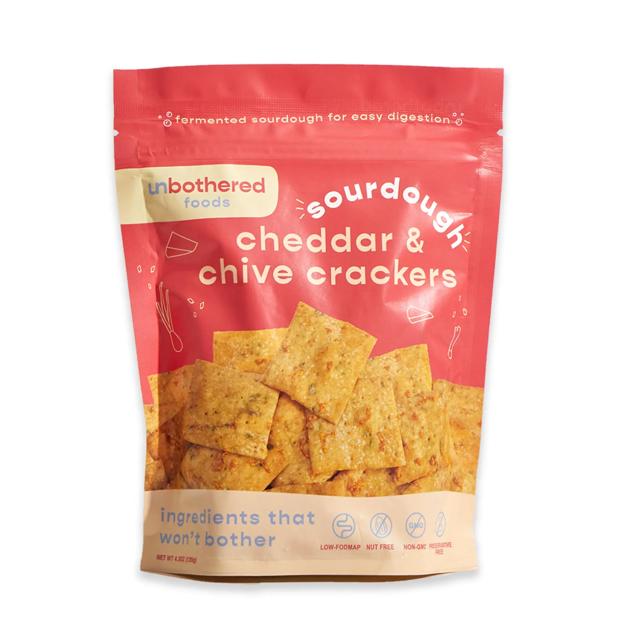 Unbothered Foods Cheddar & Chive Crackers use sourdough culture, unbleached flour, olive oil, sharp cheddar cheese, and chives. These crackers provide a rich, savory taste with real, tangy flavor and a hint of fresh herb. They are made with simple ingredients. 🌿