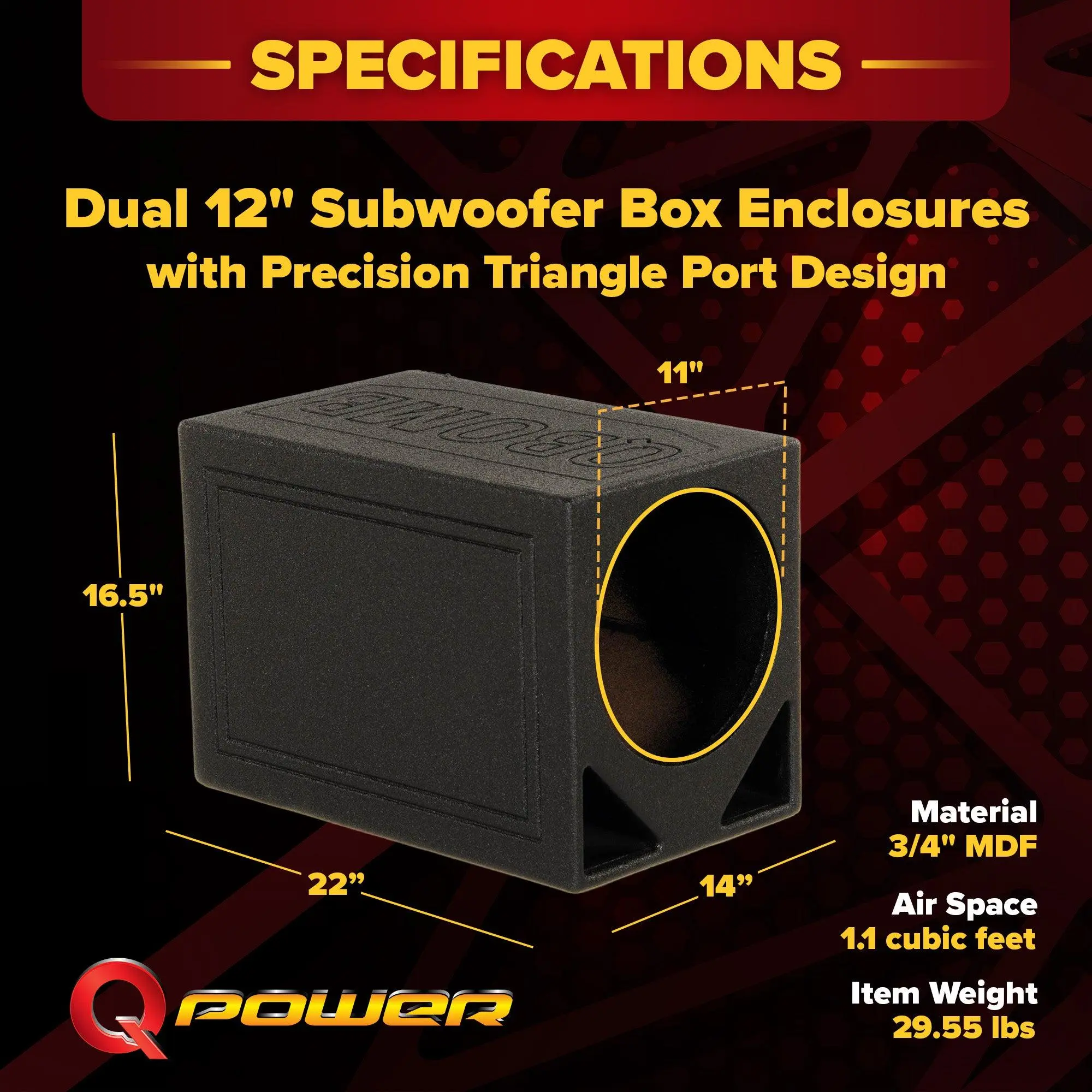 The Q Power QBOMB12TB-SINGLE single 12" triangle ported car subwoofer box is finished with durable bed liner. This box is made out of 3/4" MDF material and has high quality spring loaded terminals.