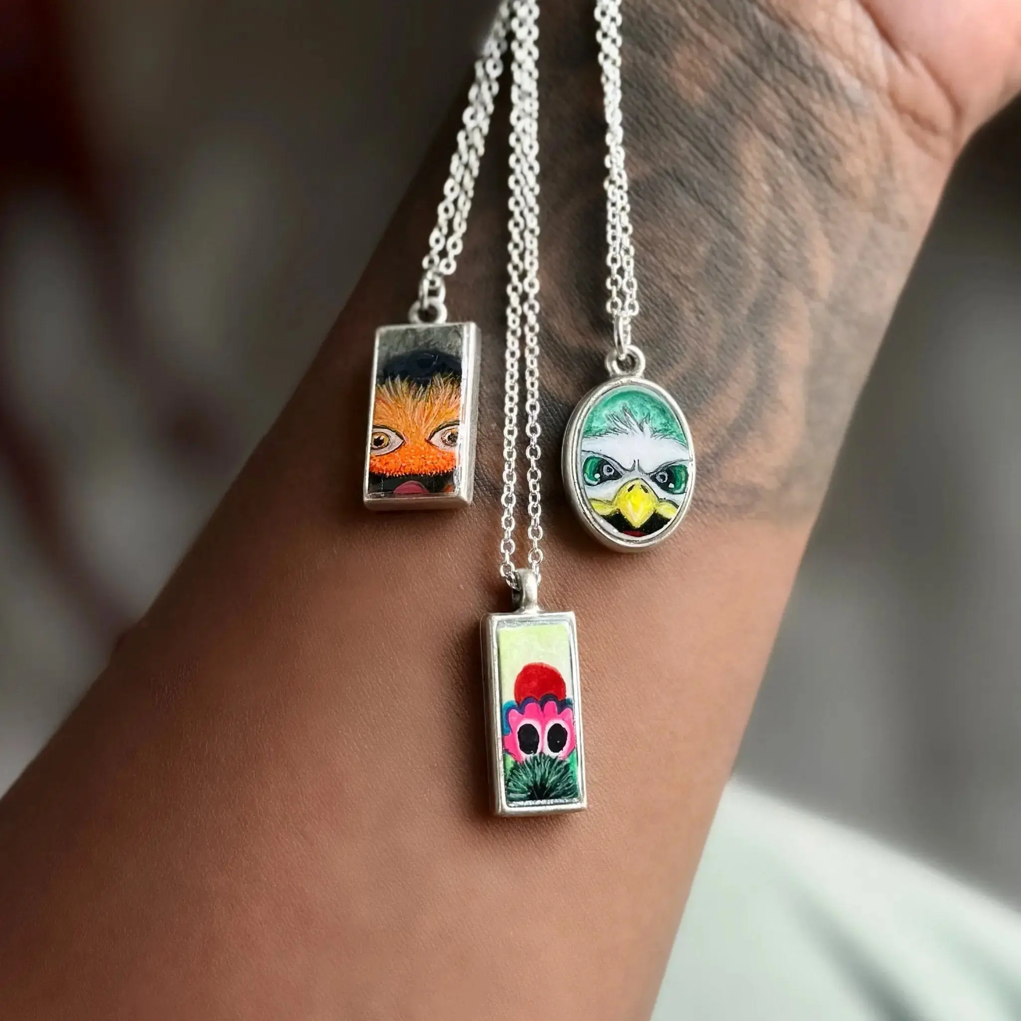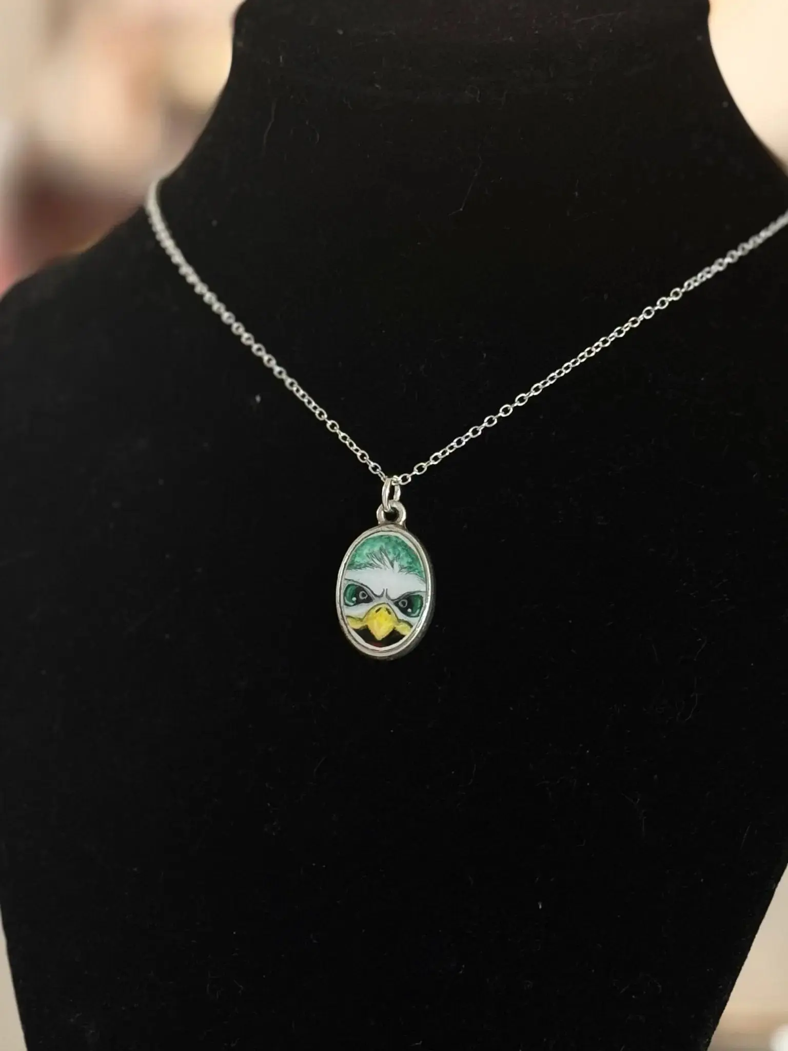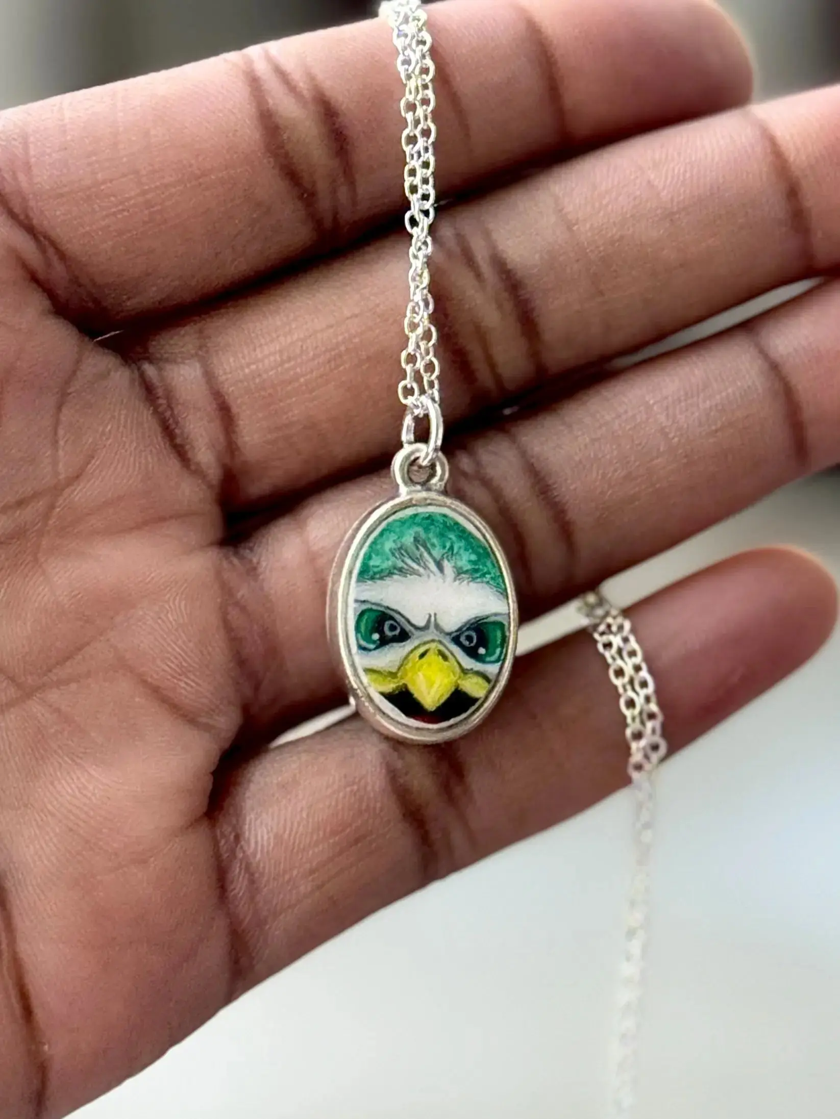 Show off your Birds pride with this one-of-a-kind Philadelphia Eagles necklace featuring a hand-painted portrait of Swoop, the beloved team mascot. Set in an 18mm x 13mm antique silver oval pendant, each charm is carefully painted by hand—no two are exactly alike, just like Philly fans.
