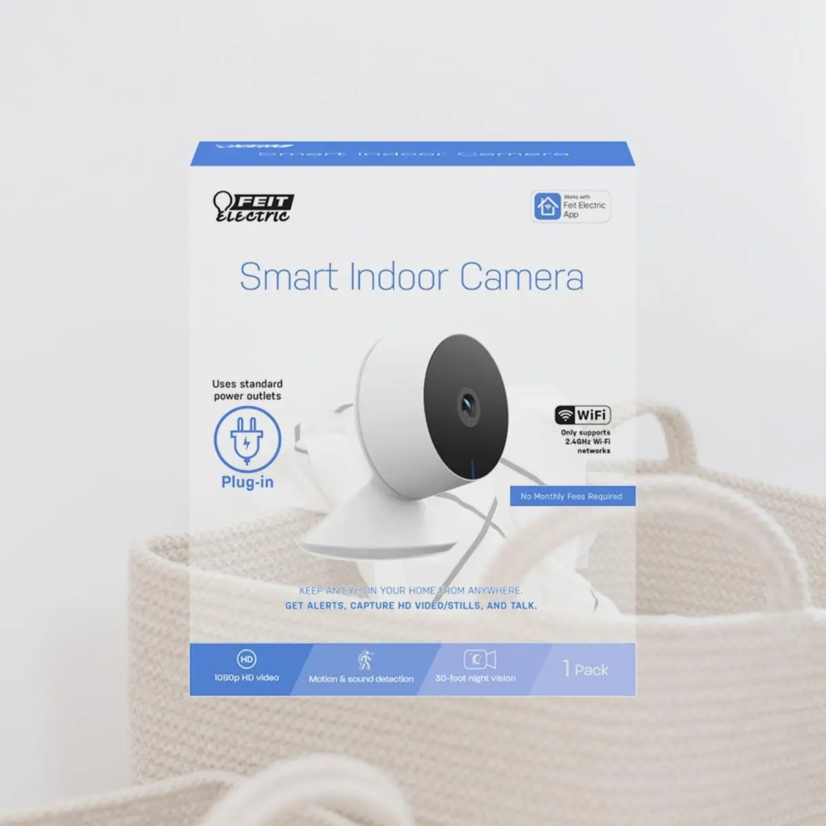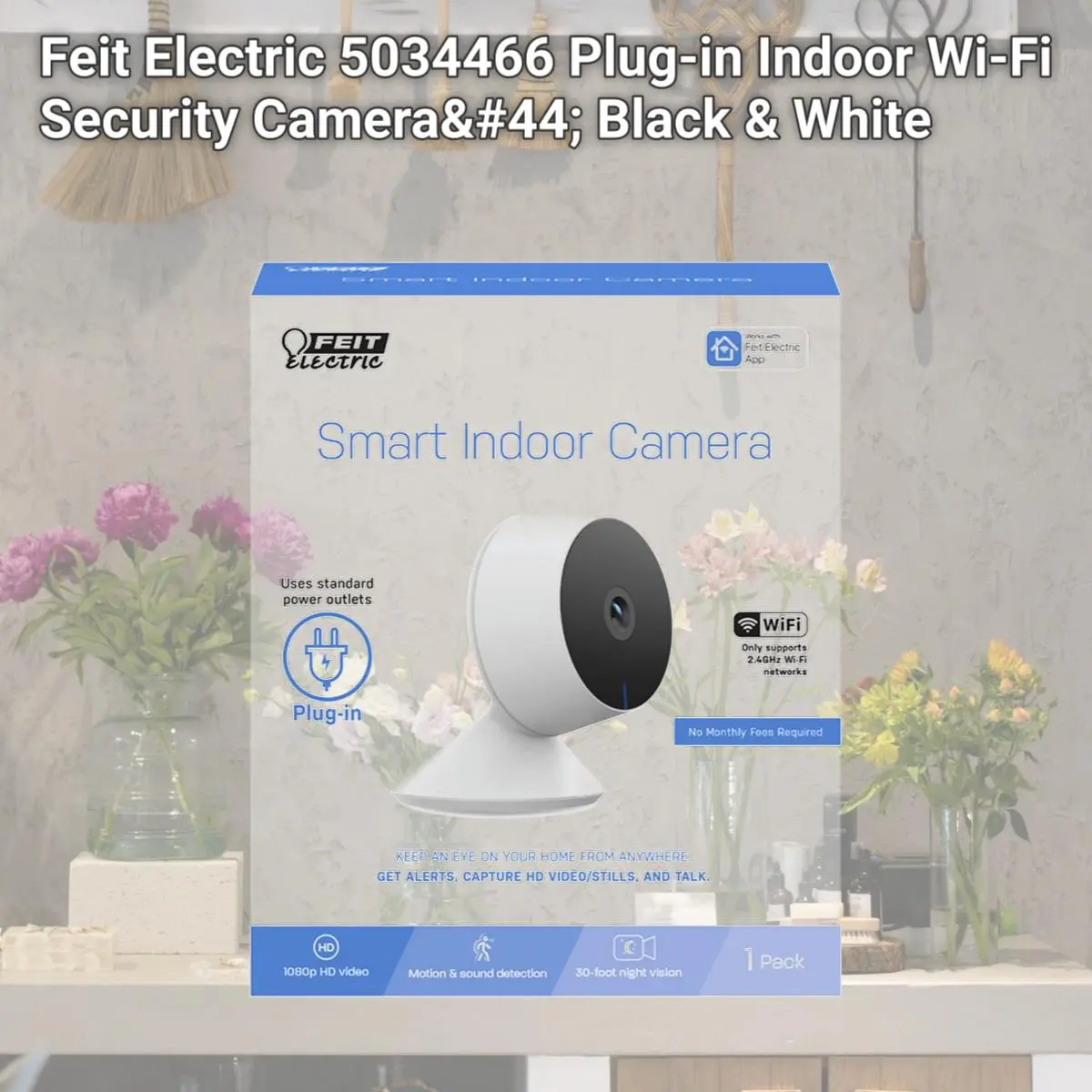 Keep your property safe with the Feit Electric indoor motion and sound-activated HD Camera with Alexa / Google. This tabletop camera allows you to monitor your home or office from anywhere on your mobile device or Amazon and Google voice assistants. Tune in any time for a live look or choose to receive an alert any time movement is detected. Specifications Color: Black & White. Material: Plastic. Height: 3.14 in.. Width: 1.95 in.. Depth: 2.83 in.. Lens: 4.0mm F2.0. Camera Resolution: 1080 Pixel. Minimum Operating Temperature: -4 deg F. Maximum Operating Temperature: 122 deg F. Night Vision Distance: 30 ft.. Input Voltage: 5VDC. Amperage: 1 amps. Power Consumption: 2.5 watts. Indoor or Outdoor: Indoor. Power Source: Plug-in. Weight: 0.44 lbs.