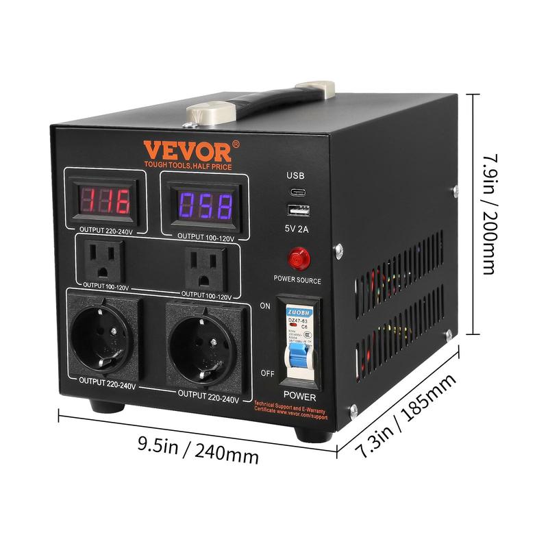 ·2000W Voltage Converter Transformer: This step up down transformer features 4 AC plugs, including 2 US NEMA 5-15R 3-Pin output sockets, 2 European Shucko output sockets, 1 5V USB port, and 1 Type-C jack. It is built with 2 LED displays showing the current output voltage in real-time to avoid transformer overload.