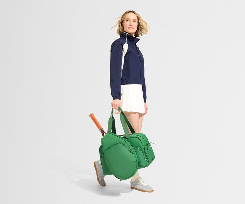The Racket Bag is designed to serve looks and win points from early morning practice sets to after-work matches. With a clean-lined design inspired by classic covers, but upgraded with plenty of smart features, it keeps your game tight, on and off the court. The structured main compartment holds a tennis racket, while an exterior zip pocket stashes your balls, water bottle, or post-game snack. It's made from abrasion-resistant, water-resistant, and antimicrobial performance fabric to hold up against sweat, scuffs, and unpredictable weather. A removable shoulder strap lets you wear it on the right or left side, while the magnetic back sleeve attaches seamlessly to the Sport Backpack or Gym Bag.