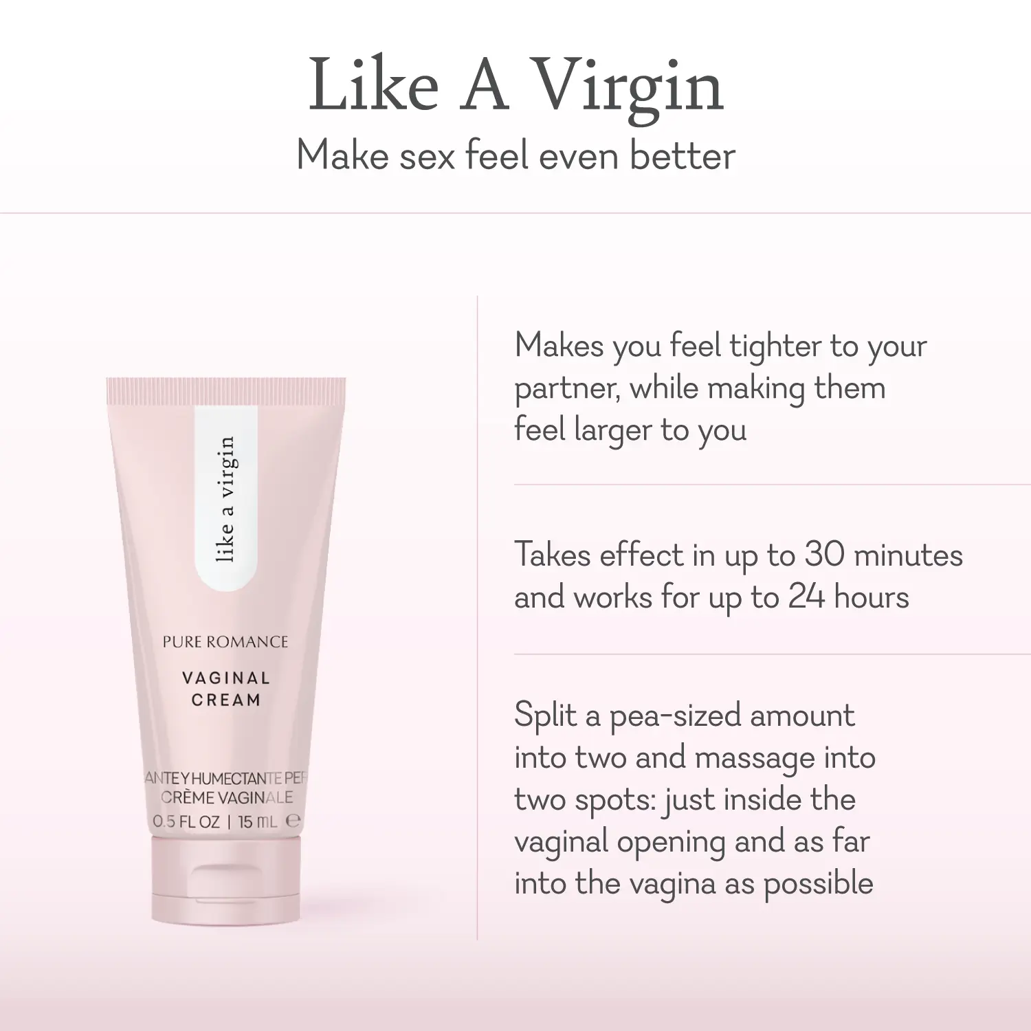 Heighten the pleasure of penetrative sex with this vaginal tightening cream. Made to work up to 24 hours, Like A Virgin makes your partner feel larger to you, while you feel tighter to them. After applying, this powerful formula takes effect in up to 30 minutes and pairs perfectly with a water-based lubricant. Try it with a partner or your favorite sex toy and feel the difference.