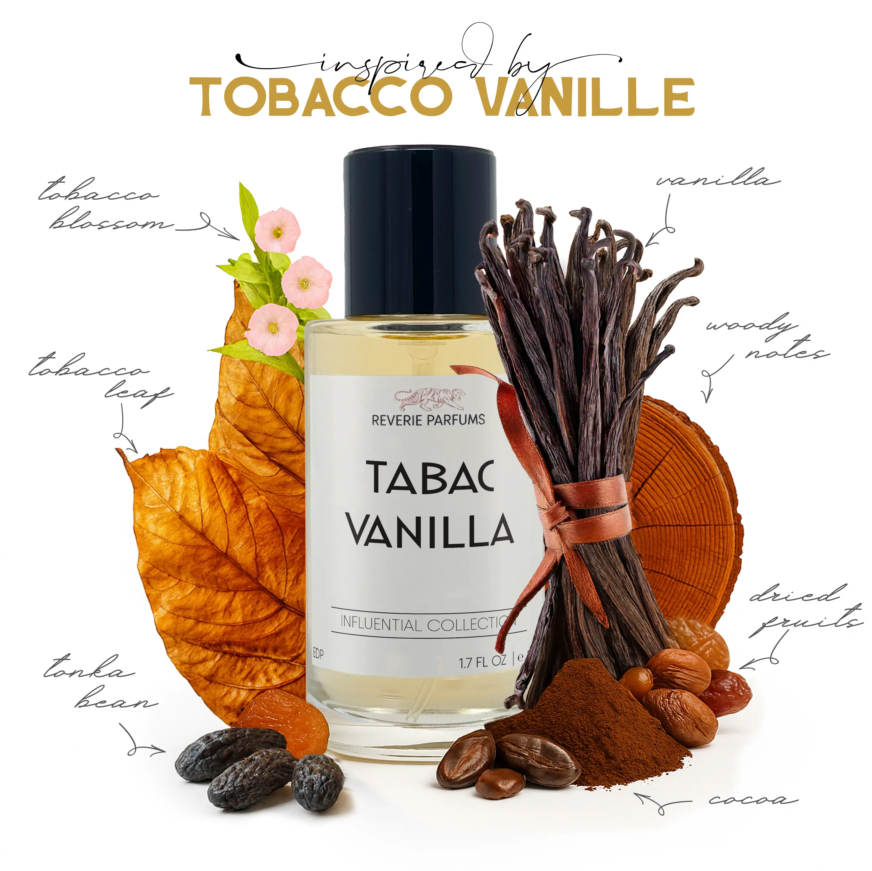 Wrap yourself in timeless warmth with Tabac Vanilla, a luxurious fragrance by Reverie Parfums inspired by the iconic T*ba*co Vanille . This opulent scent opens with rich t*ba*co leaves and aromatic spices, melting into a heart of creamy tonka bean, cocoa, and smooth vanilla. The result is a sensual, comforting blend that exudes depth and sophistication. Crafted with the finest ingredients, Tabac Vanilla delivers the richness of a designer fragrance at a fraction of the price. Indulge in bold elegance—experience true luxury for less.