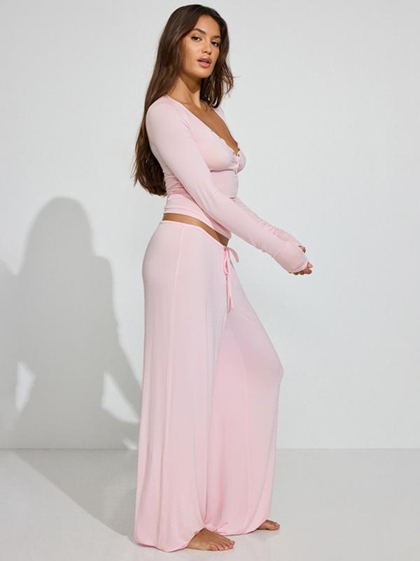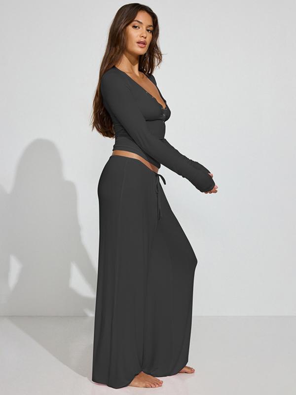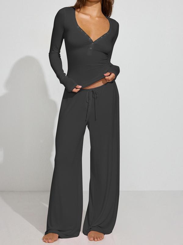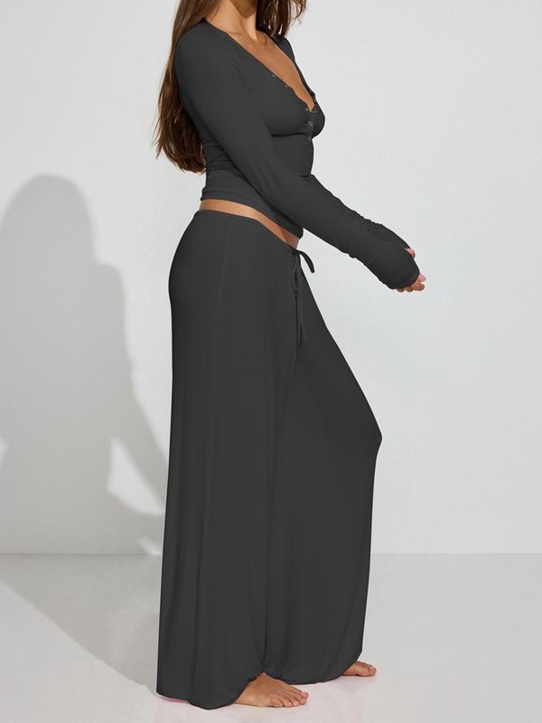 Women's Casual Long Sleeve Button Front Top & Drawstring Wide Leg Pants Set, Spring Summer Comfortable Daily Wear, Basic Style #pajamas #sleepwear #sweatpantsoutfit #pjsets #sweaterset #womenssweatshirtset #sweatsuitset #womenspjs #womensloungewear #fashionablewomensclothing