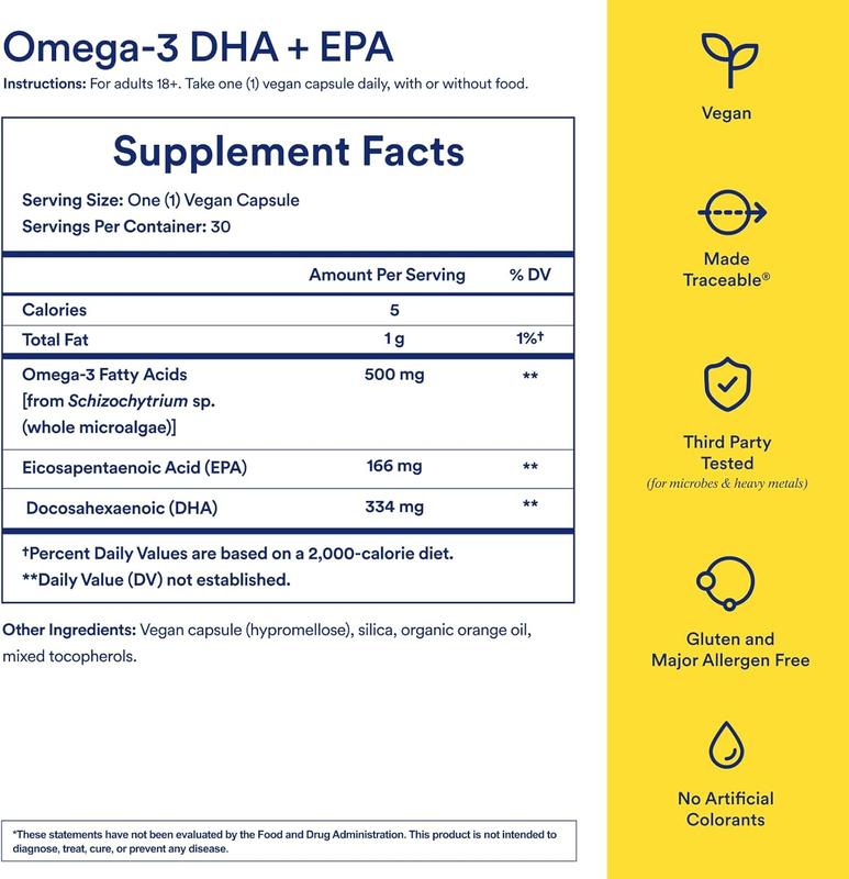 ·BIOAVAILABLE OMEGA-3: A vegan, bioavailable form of Omega-3 fatty acids from microalgae, sourced from an extraction process that has the environment in mind. Algal oil is a vegan source of DHA and EPA. In fact, Omega-3 DHA and EPA are synthesized by microalgae, not fish.*