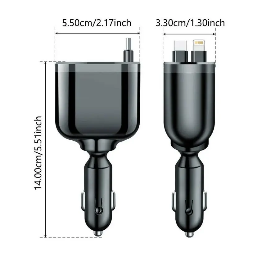 【Retractable Cables】: Equipped with two extendable cables, providing flexibility and reducing clutter in your car.