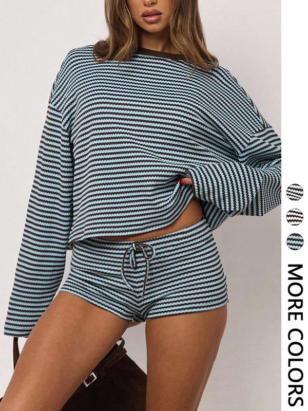 Women's Casual Striped Long Sleeve Top + Shorts Set, 2 Piece, Comfortable and Stylish, Perfect for Daily Wear