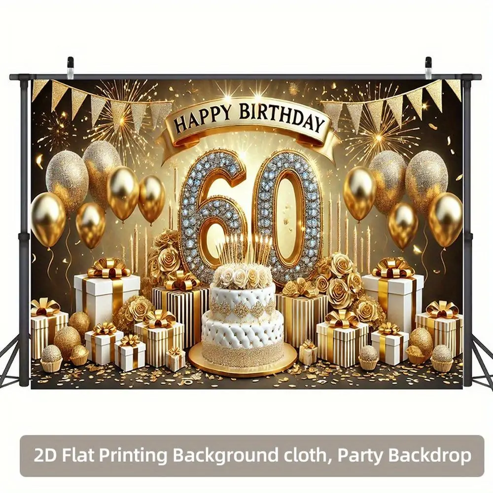 1pc 2D Flat 60th Birthday Party Backdrop - Golden Glitter "152.4cm with Balloons, Confetti & Gift Boxes, Polyester Photography Background for Indoor/Outdoor Celebrations, No Power Needed, Perfect