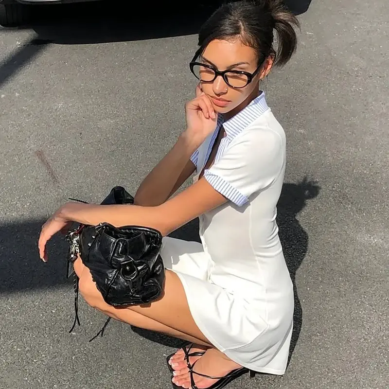 Women's Colorblock Striped Shirt Lapel Collar Patchwork Buttons Short Sleeve Bodycon T-Shirt Dress, Contrast Color Single-button Front Cardigan Package Hip Short Dress, Y2K Party Club Holiday Daily Casual Mini Dresses For Ladies Summer All Seasons Clothe Fabric composition: Polyester fiber