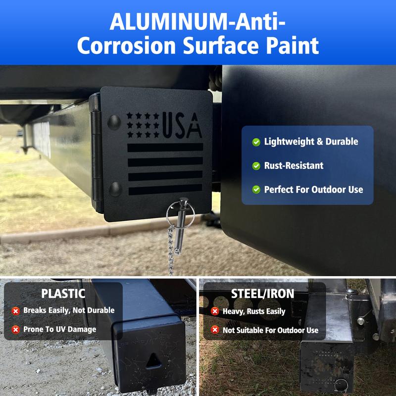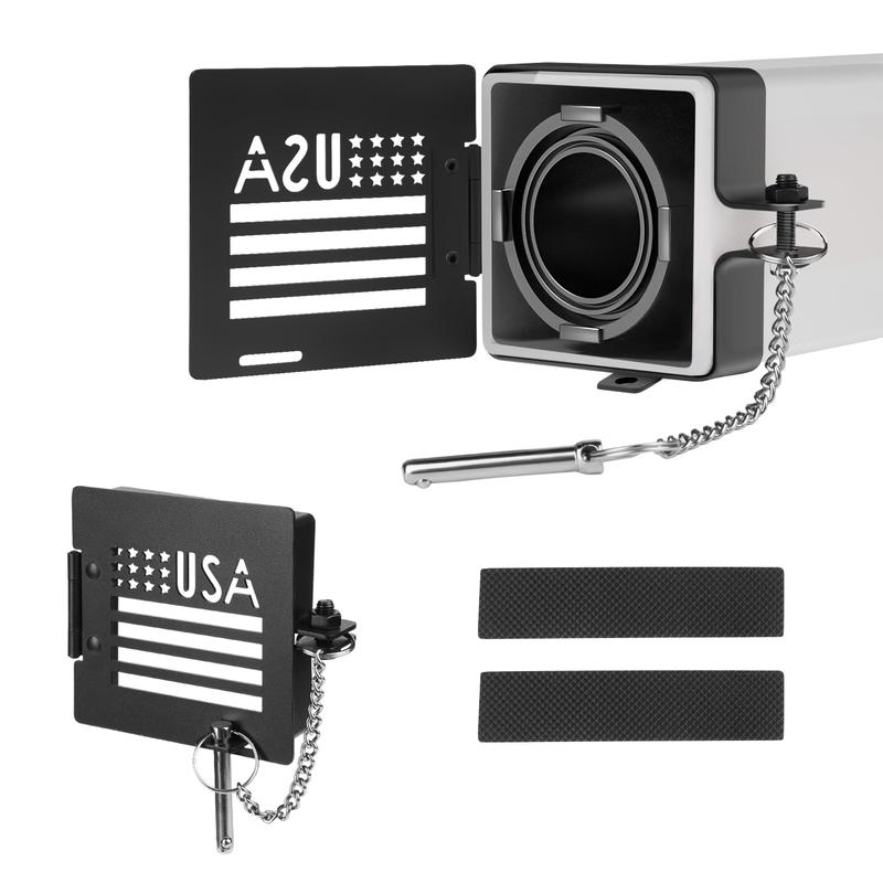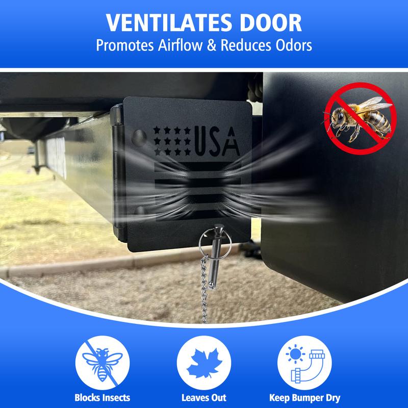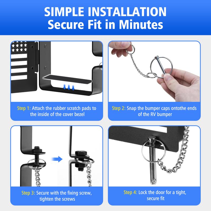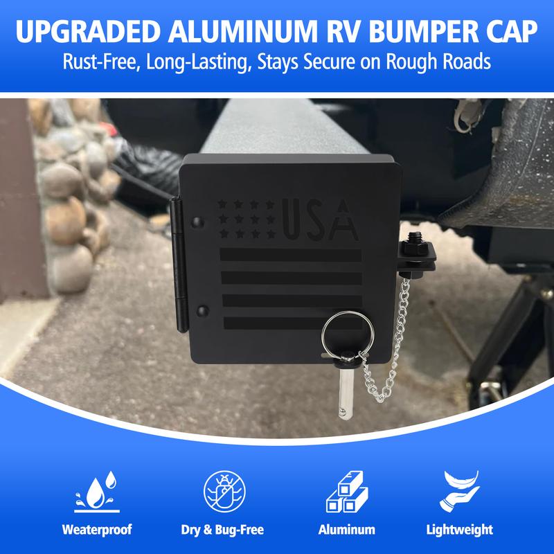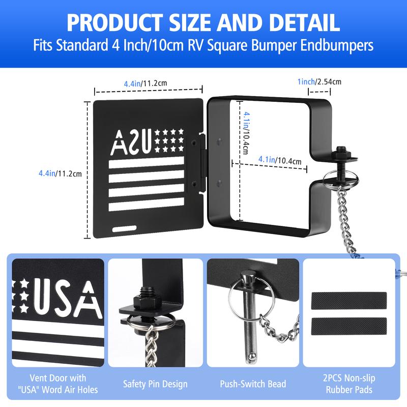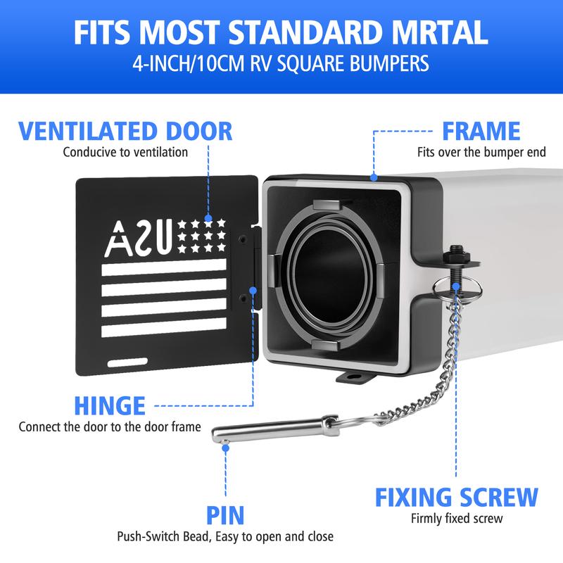 【RV CAMPER BUMPER CAPS】Use this Bumper Cap Cover to prevent the sewer hose from coming off the bumper while the RV is in motion and being dragged causing damage. 【HIGH QUALITY MATERIAL】High Quality Iron stable materials used to ensure long-lasting durability and reliability. Easy installation process that does not require any additional tools or equipment,trailer bumper end caps. It prevents dirt, weatherproof, and other external debris from entering the bumper, which can help prevent rust-resistant and damage. 【SECURE & RELIABLE DESIGN】Safety pin prevents the cover from opening while the RV is in motion, avoiding the dump hose to fall out of the bumper. Small vent holes provide airflow and double as an insect screen. 【EASY INSTALLATION】Snap the bumper caps onto the ends of the RV bumper, tighten the screws, then insert the pins to complete the installation, and pull out the pins when you need to open them. You can attach the matching non-slip rubber pads to the inside of the cover bezel to make the installation fit better before using. 【UNIVERSAL FIT ACCESSORIES】Square bumper end cap fits on the end of most metal 4 inch square bumpers and will conceal sewer hoses. Suitable for various types of trailers, including camping trailer, tow trailer, and rv, making it a versatile accessory,bumper plugs.