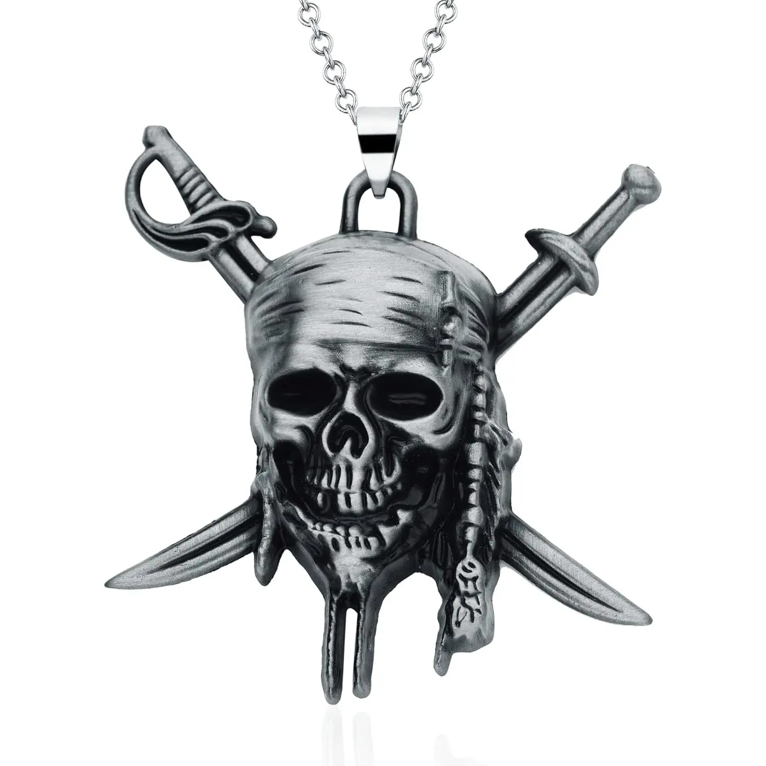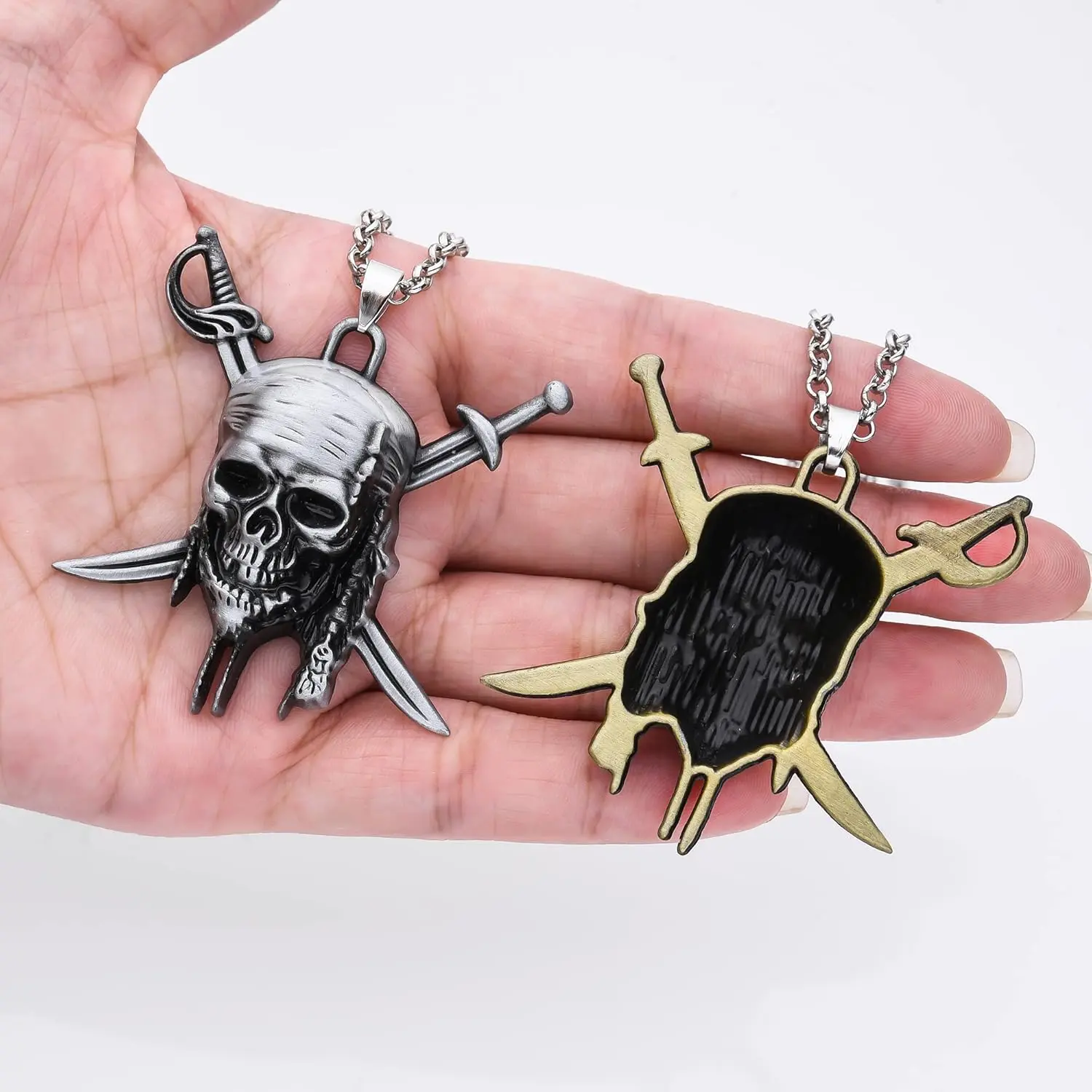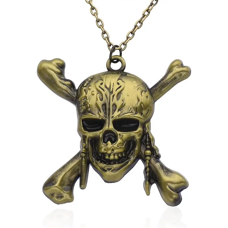 Size: 1.96 * 1.81 inches, chain length: 19.68 inches, weight: 18.9 gramsMaterial: alloy, plated with bronze No fading, no allergyDesign: inspired by pirates of the Caribbean.pirates of the caribbean Skull necklaceGift: pirate skull necklace a good gift for fansService: if there is any problem with the product, change the product at any time