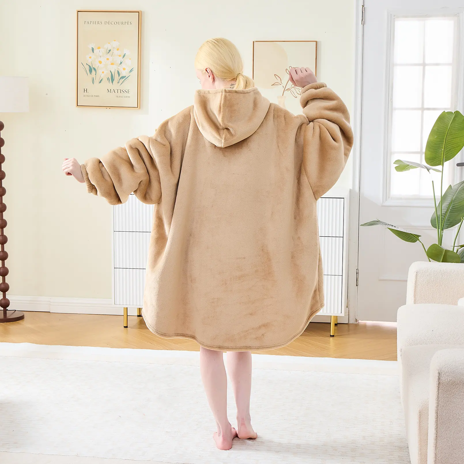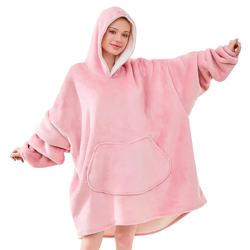 This Warm Homewear Hoodie is unisex and wearable as a blanket. It's ideal for winter loungewear, offering warmth and softness. The hoodie features a giant pocket, making it extra functional. Perfect as a winter gift, it's also great for Christmas family gatherings. This sweatshirt is extra long and thick, ensuring you stay cozy. Fleece lining adds to its comfort.