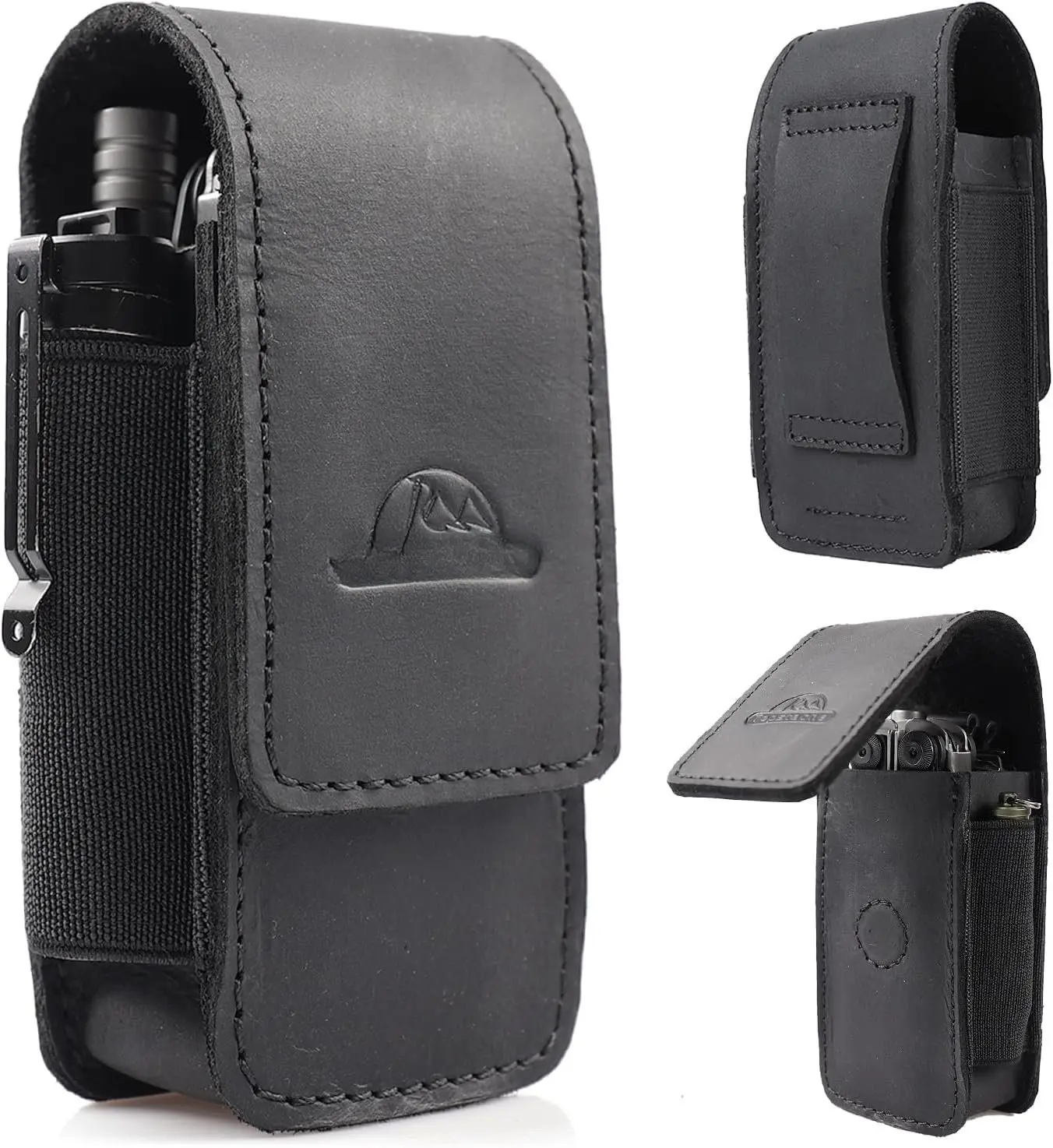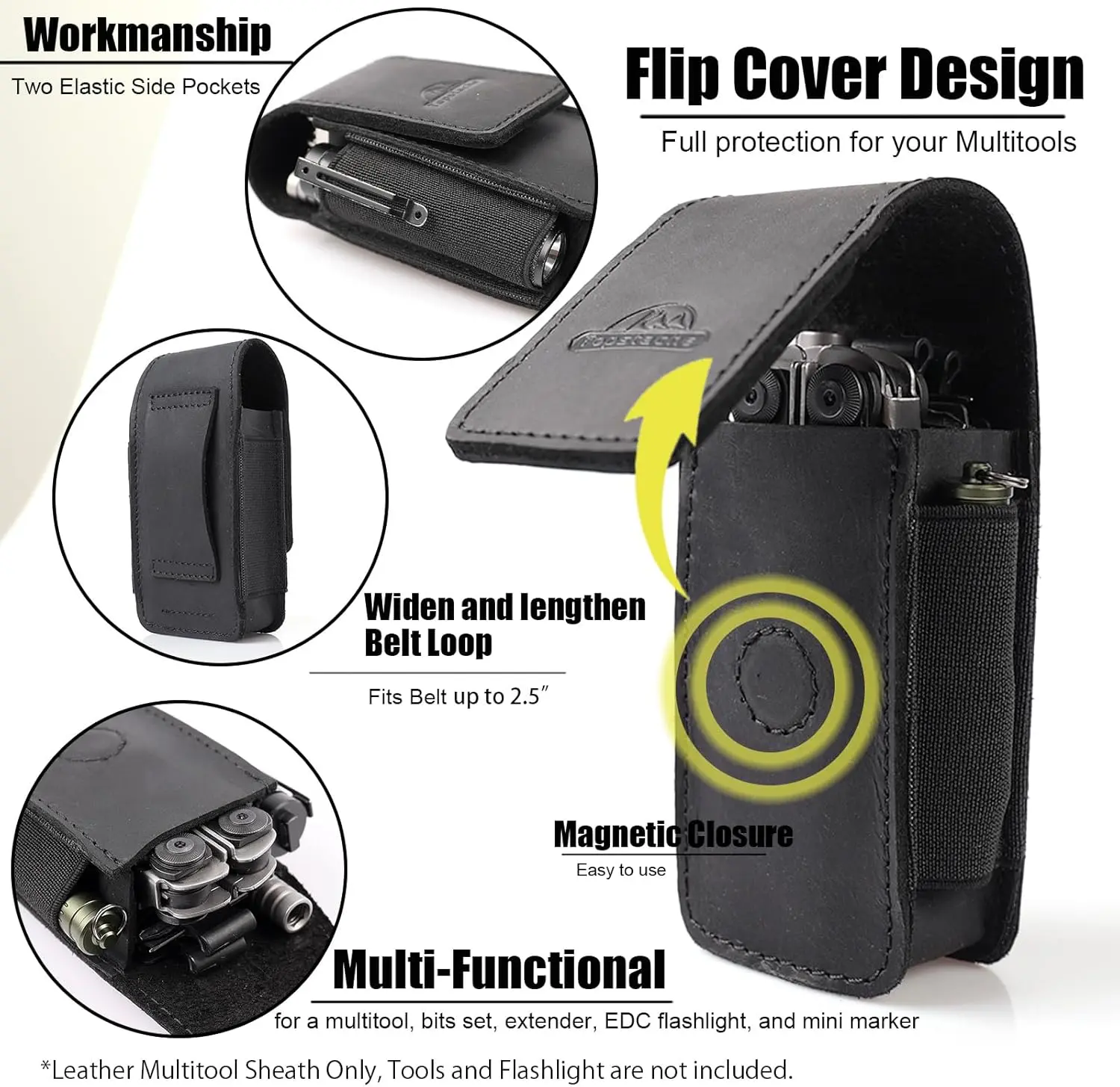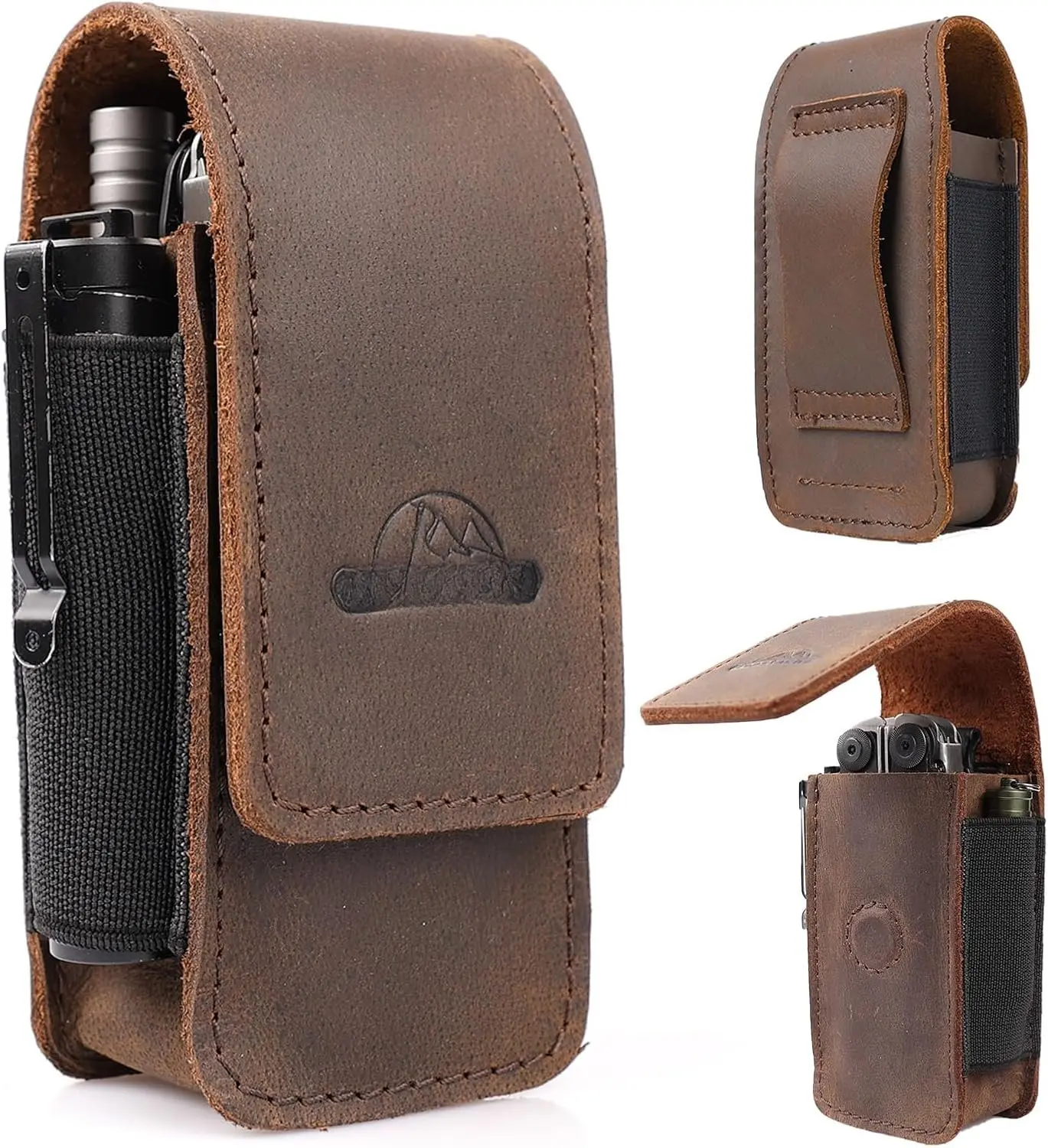 【Built to Last】The main of the leather multitool pouch is made of Crazy Horse Leather, and elastic bands on both sides, which can hold different tools. High-quality Crazy Horse Leather with fine and tight stitching, smooth and scratch-resistant surface, comfortable to use, and long-lasting.