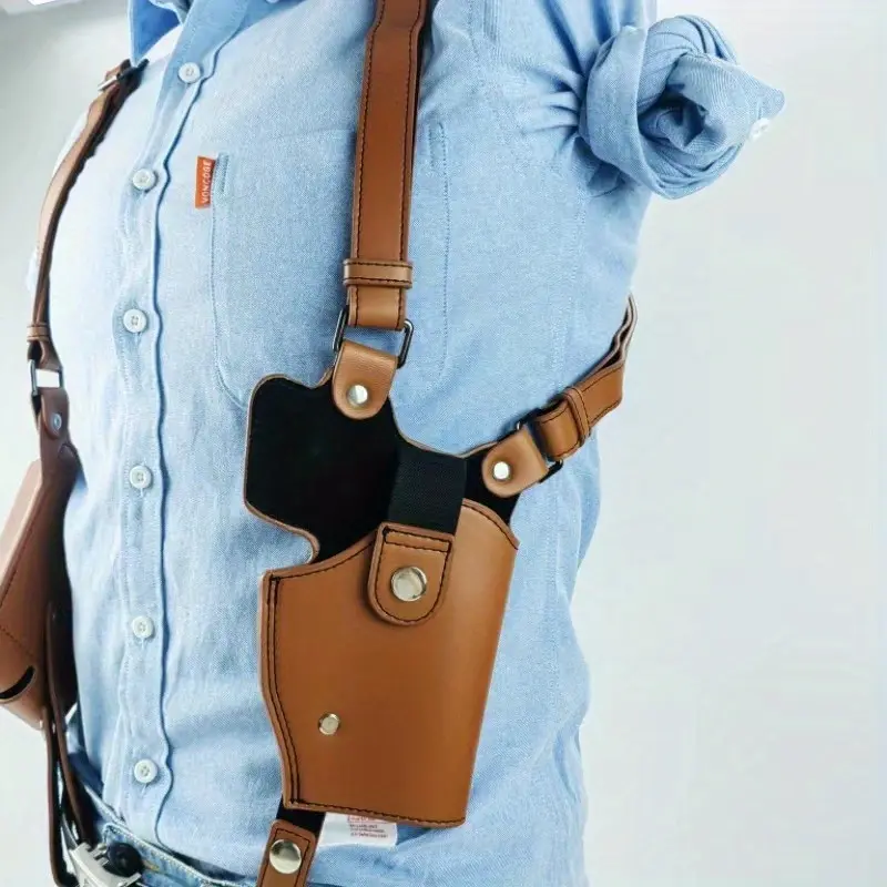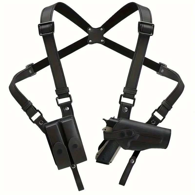 Adjustable shoulder holster with dual magazine clips, universal vertical concealed carry holster, fits 1911 and most pistols, premium leather (brown/black)
