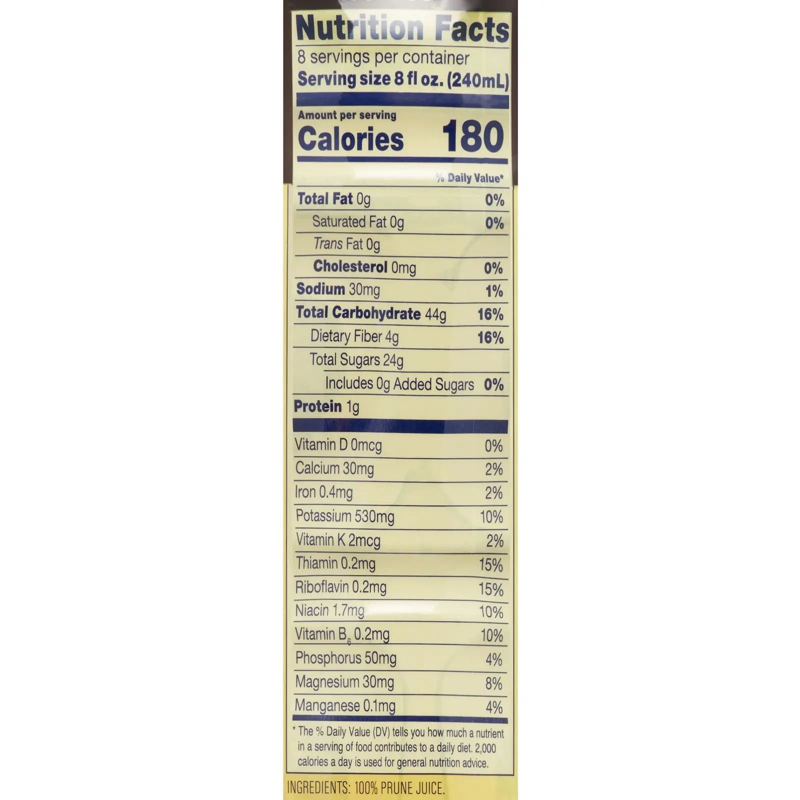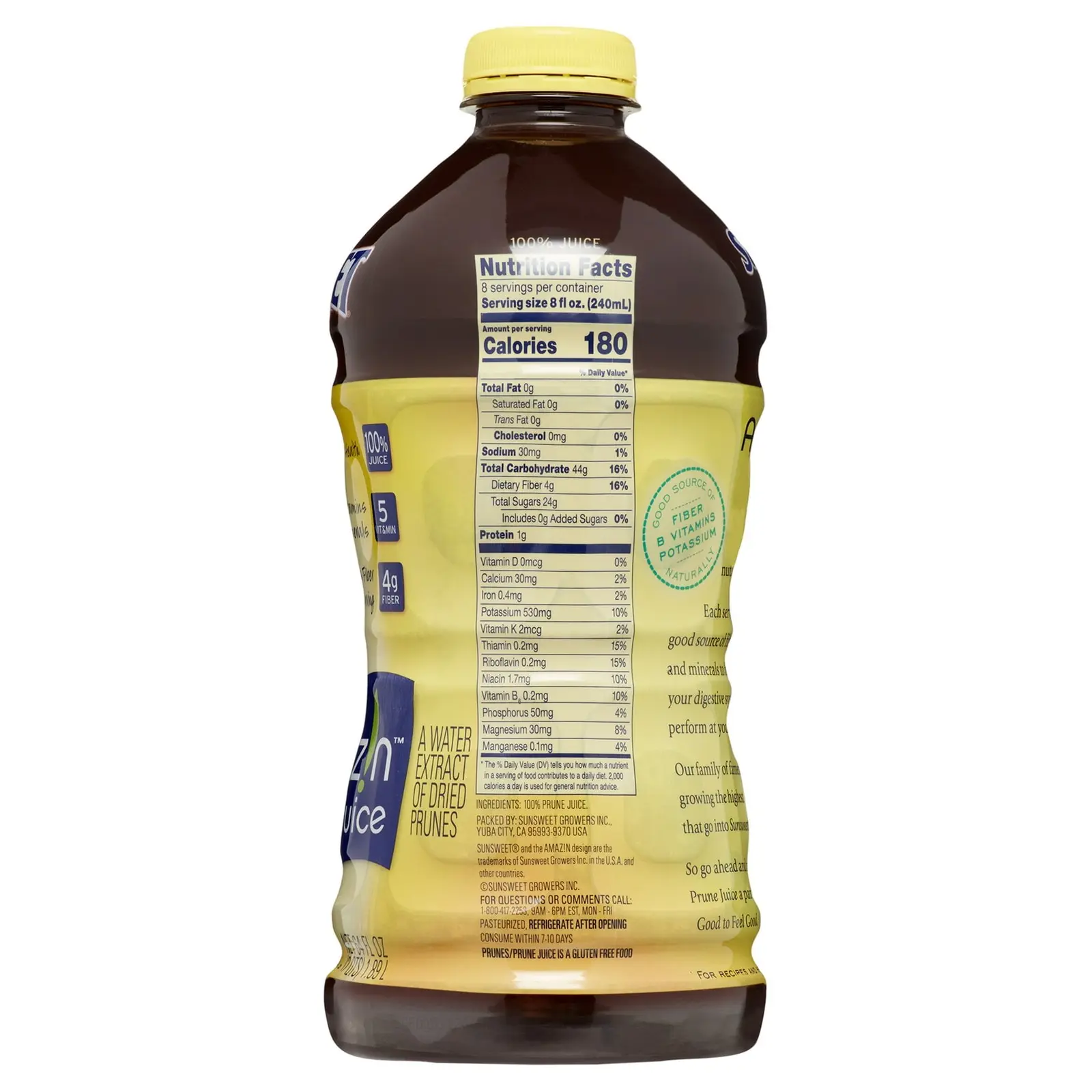 Sunsweet AmazIn Prune Juice is more than just a refreshing beverage—it's a daily dose of wellness for your body. Every 8oz glass of this juice is enriched with 4g of high fiber and five essential vitamins and minerals, including potassium, riboflavin, vitamin B6, copper, and niacin. This power-packed juice with no sugar added is formulated to support digestive health, thanks to its natural prebiotic fiber. With its low glycemic index and high fiber content, it sustains energy longer, making it a perfect choice for those needing a gut cleanse detox or looking to maintain digestive support without added sugars. Elevate heart health and ensure a nutrient-rich diet with Sunsweet AmazIn Prune Juice. Its unique formulation, low in fat and free from added sugars, contributes to weight balance and may help lower the risk of heart disease. Enjoy the benefits of a pure, no sugar fruit juice, that aligns with a healthy lifestyle—from maintaining gut health to supporting digestive health with ease. Each juice 64 oz bottle is a testament to how natural juice can conscientiously nurture both your body and well-being. Incorporate this essential organic juice into your daily routine for a seamless blend of taste and health benefits. Ideal for those seeking prune juice for constipation or aiming for a sugar free option that doesn’t compromise on quality. Sunsweet’s commitment ensures a deliciously smooth and Kosher bottled juice that’s not only a pantry staple but a smart choice for every health-conscious household.
