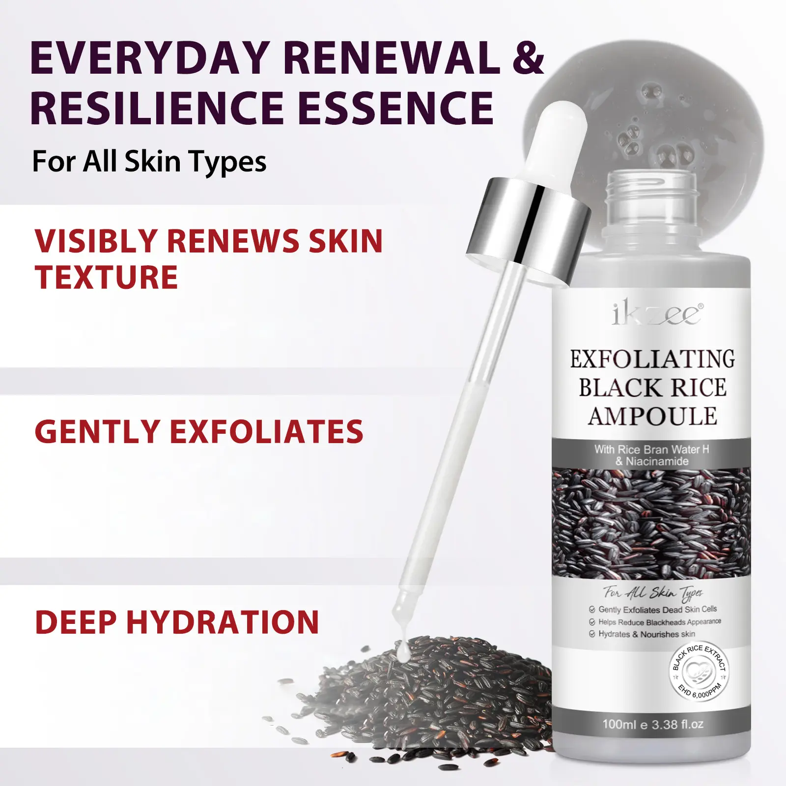 ikzee Black Rice Exfoliating Ampoules 100ml, Hydrating Exfoliant, a gentle mild daily exfoliating scrub for face and body, brightens and removes dead skin cells from all skin types, a daily skincare product.