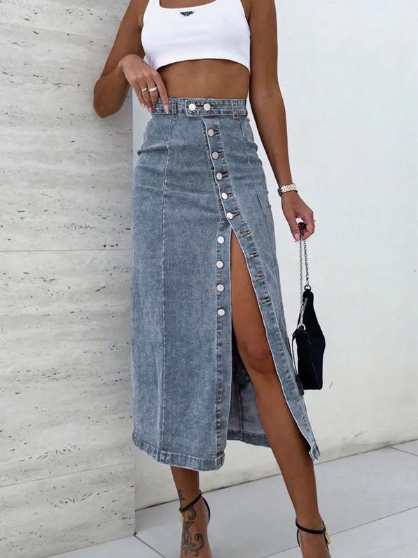 Elastic Washed Casual Button Fly Denim Midi Skirt for Women #denimskirt #jeansskirt #denimskirtoutfit #tiktokshopblackfriday #tiktokshop