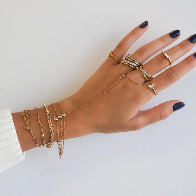 The Audrey Hand Chain brings fun and class to your jewelry collection with its triple gemstone accents and three interconnected chains.