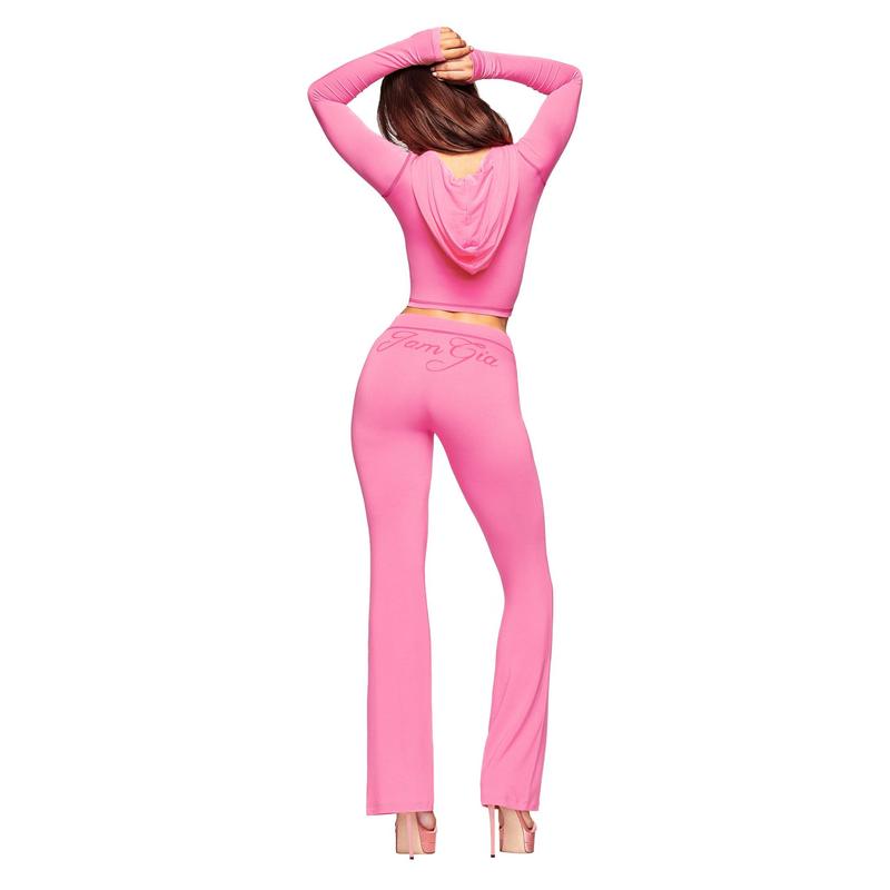 Ā·Bright pink hoodie with contrast neon pink GIA logo across the chest using plastisol printing technique