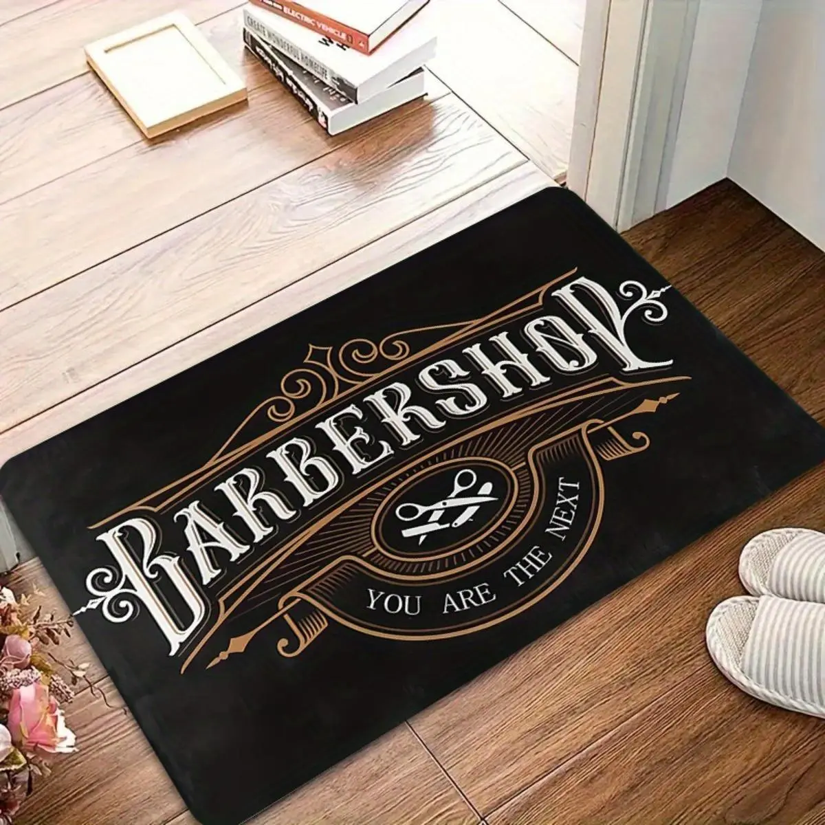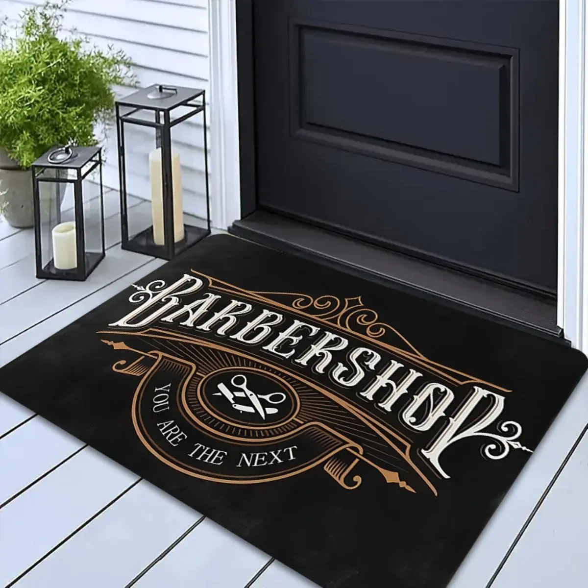 ·Design & Theme: This doormat features a vintage barbershop design with crossed scissors & razor, in black & gold. Perfect for barber gifts & retro decor. 🌟