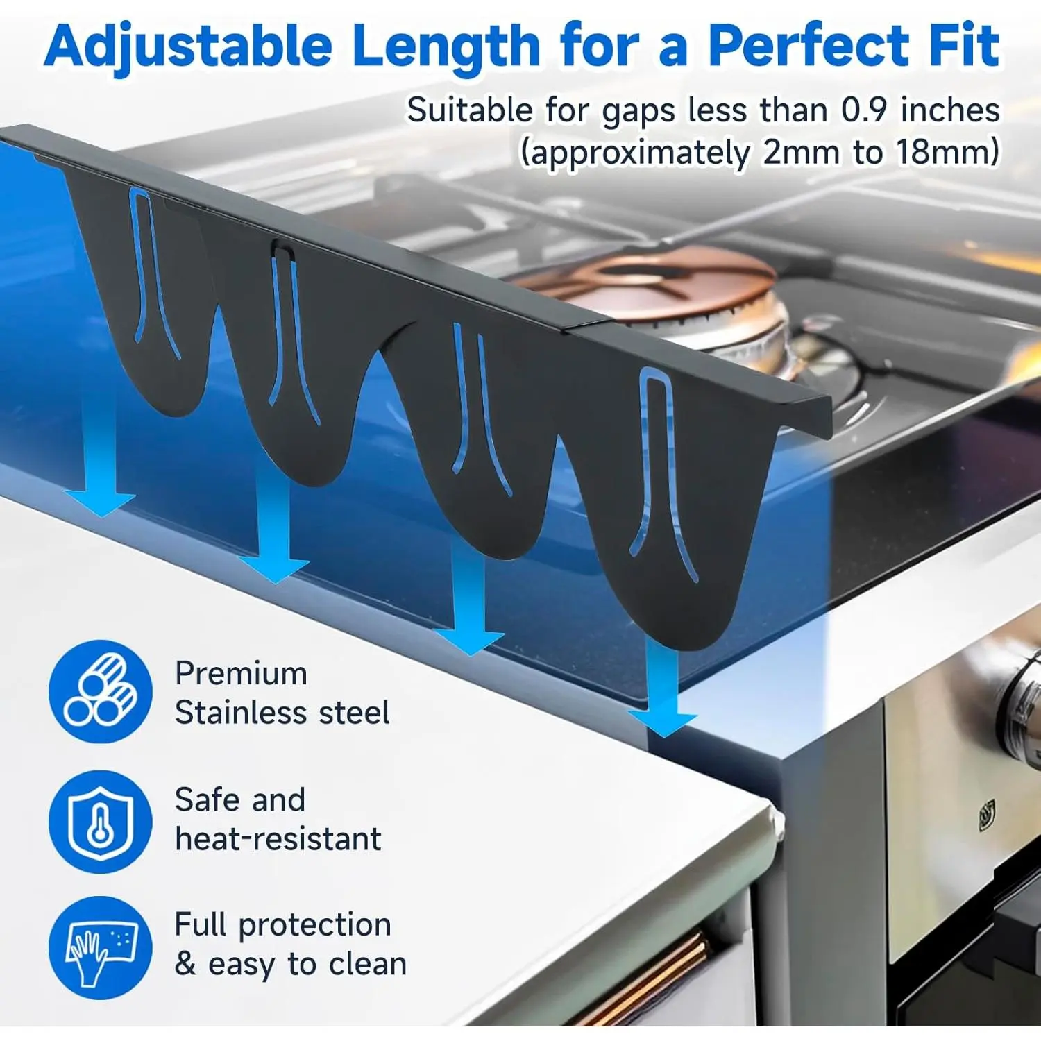 【Please Note】 Stove Gap Covers come with adjustable lengths from 13.8" to 27.5", making them ideal for filling gaps between your stove and countertop. They fit gaps between 2mm and 17mm, ensuring a fit for stoves and countertops. a clean, seamless kitchen with ease