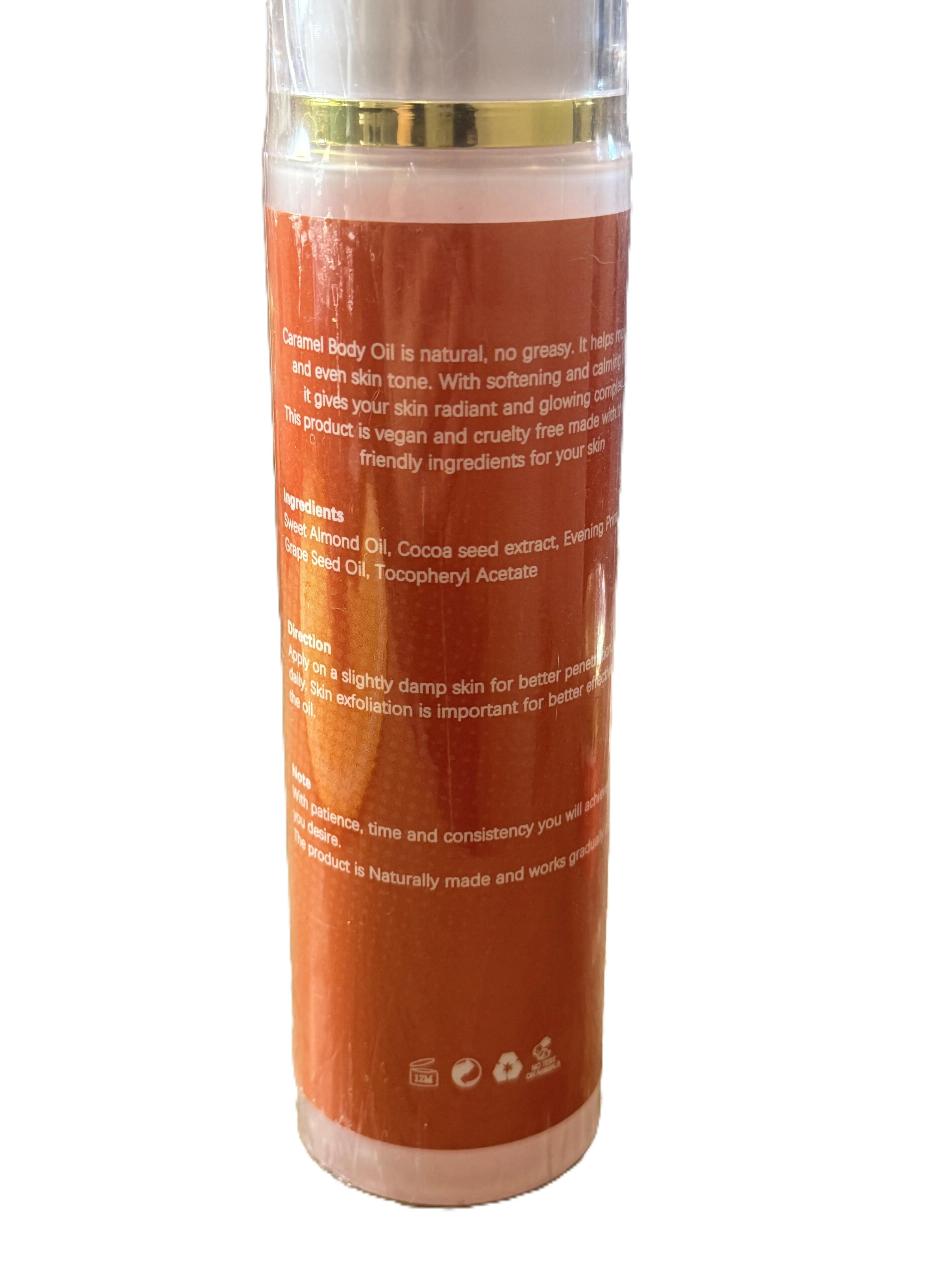 Caramel body oil is natural, no greasy. It helps moisturize and even the skin tone. With softening and calming body. It gives your skin radiant and glowing complexion