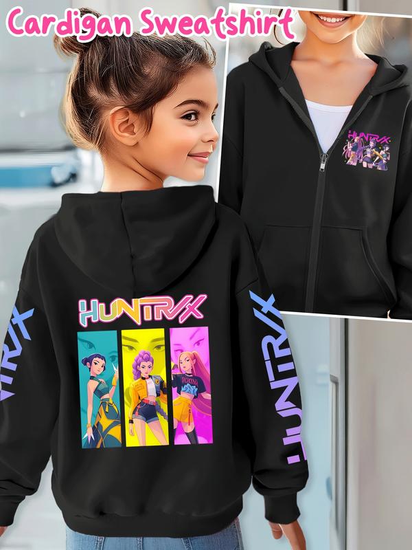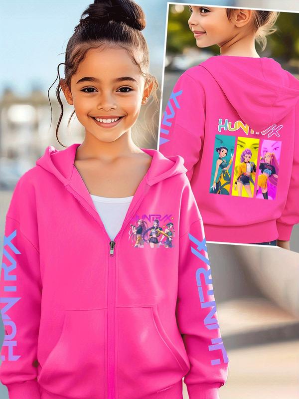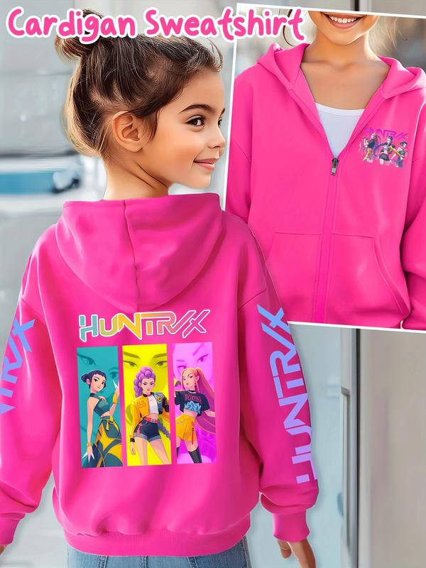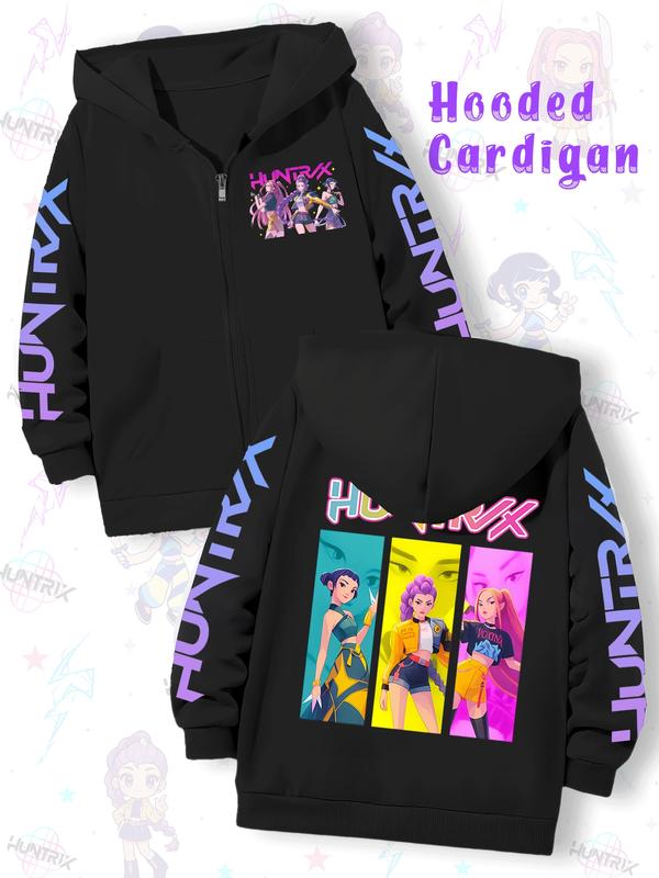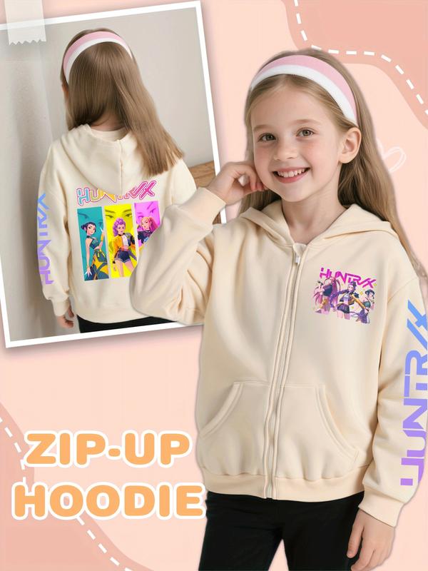 Girls' Kpop Demon Hunters Graphic Casual Hoodie Jacket, Cartoon Print Zipper Sweatshirt, Fall & Winter Fashion, Comfortable Kids Clothing