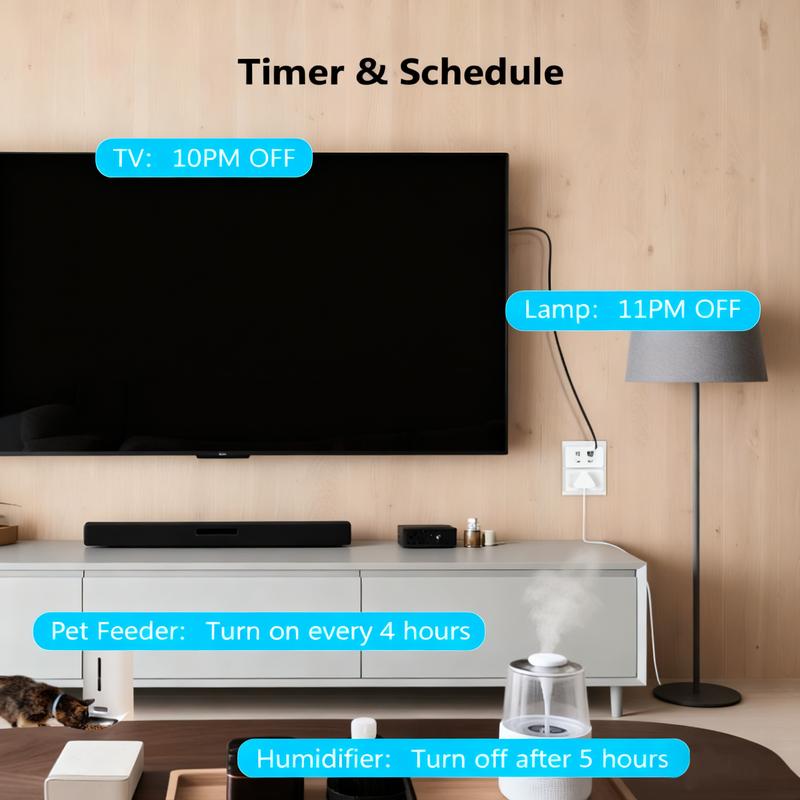 Easily set timers, countdowns, or recurring tasks. For example, set your lights to turn on at 8 a.m. or your humidifier to turn off after 5 hours. Simplify your daily routines.