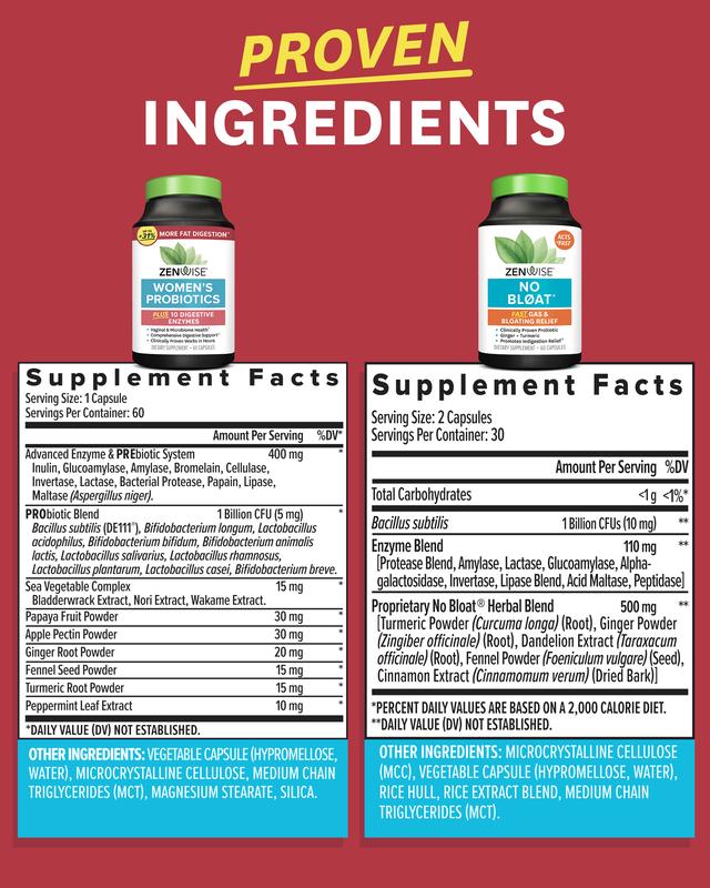 Support digestive comfort with Zenwise No Bloat. Our No Bloat supplements include a blend of digestive enzymes, clinically proven probiotics, and organic botanicals to help ease water retention bloating, gas, and other digestive discomfort.